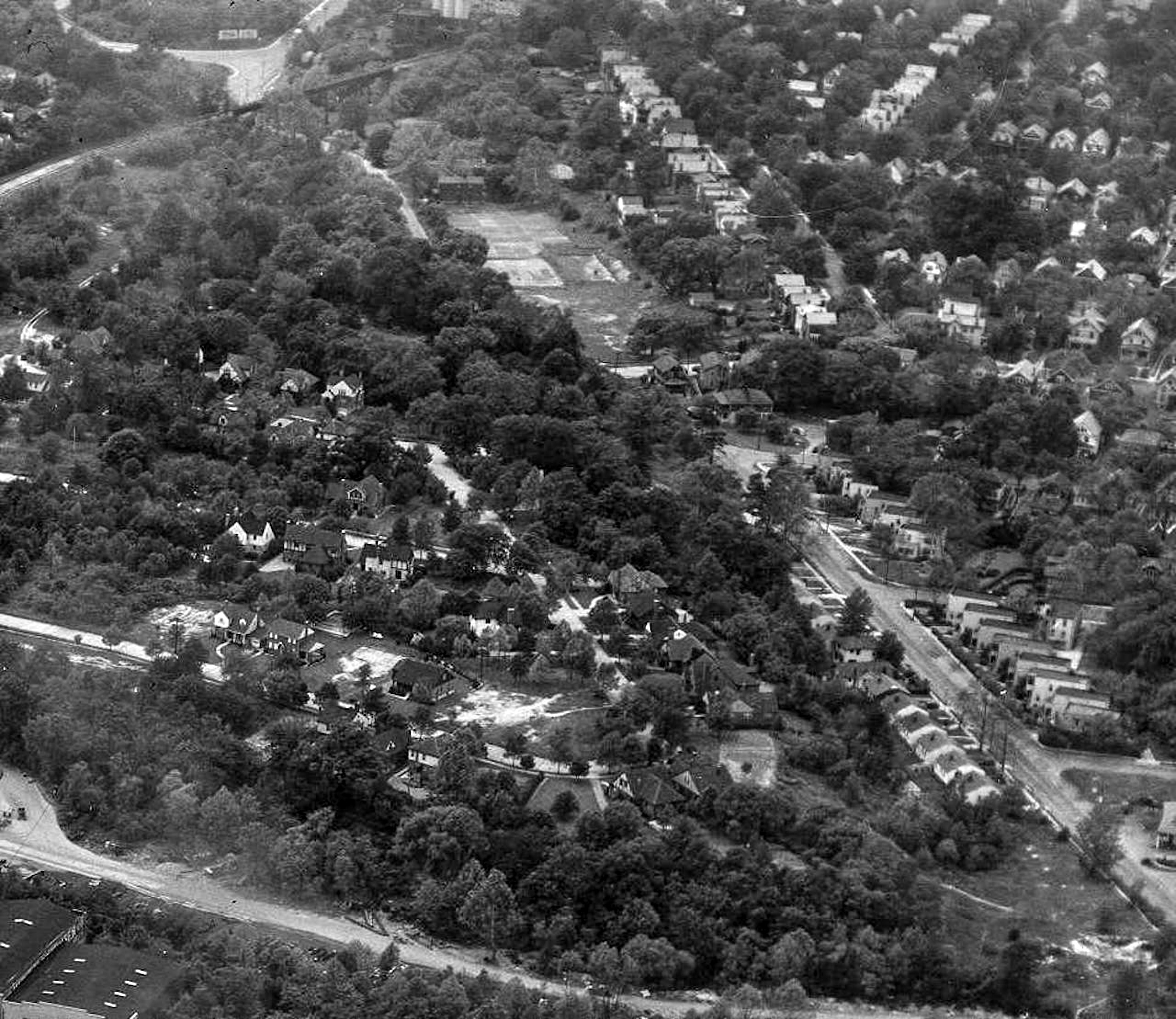 Historic aerial of the Duck Creek Valley between Hyde Park and Norwood, looking northwest from the approximate location of Don Pablo's in Rookwood Pavilion. The N&W Hyde Park Branch trestle over Duck Creek Road at Dana is visible at the top left. The corner of Hyde Park Lumber is at the bottom left. This photo was probably taken in the mid to late 1940s. Photo from duckcreek.org