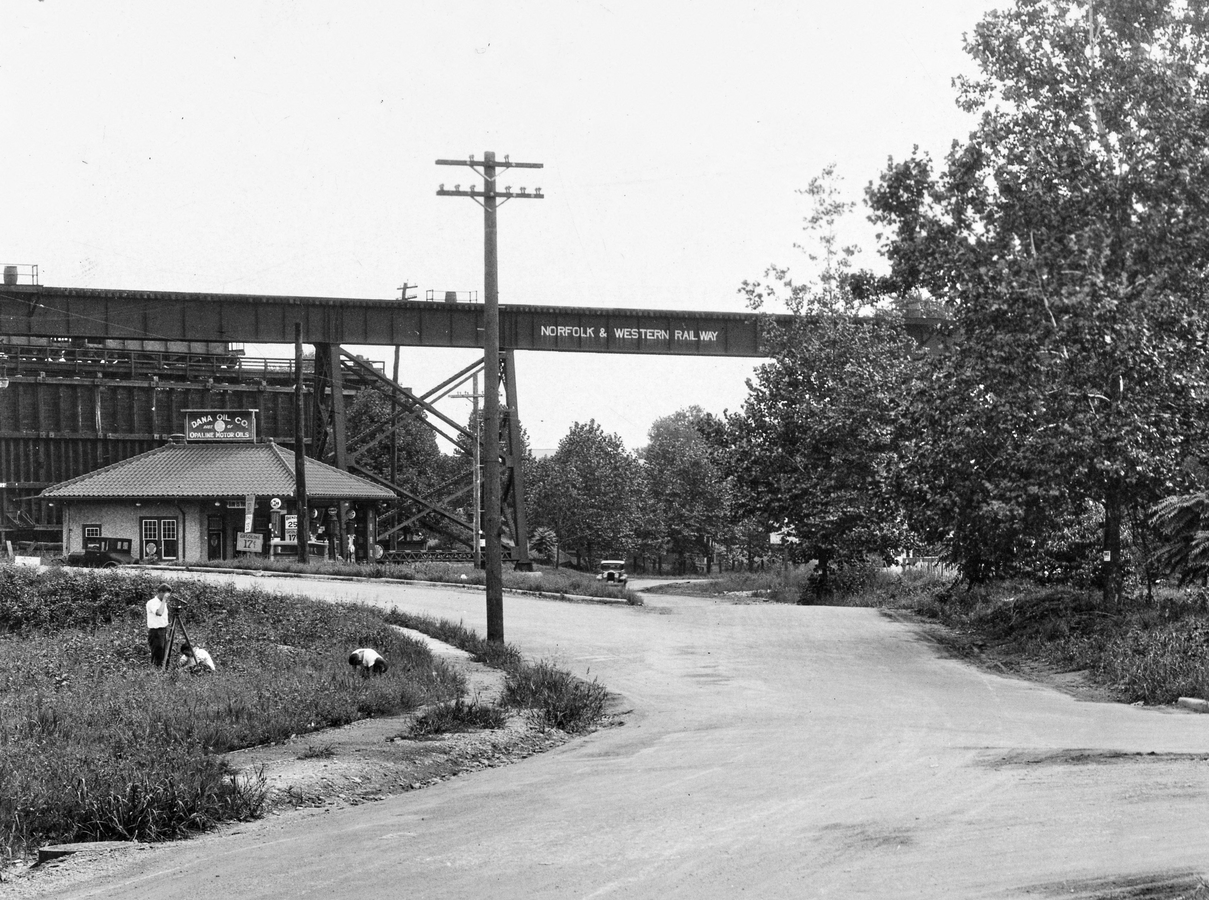 Close-up of the historic photo of Duck Creek Road and the N&W Hyde Park Branch trestle at Dana Avenue, looking northeast from Potomac Avenue. In 1929 Vista Avenue was connected to Dana with a bridge over Duck Creek on the far side of Potomac. The guys in the weeds on the left are surveying for the new bridge. The large structure behind the Dana Oil Company gas station is a coal dumping platform for transferring to wagons. All of this was obliterated for construction of I-71. From the University of Cincinnati Library Digital Resource Commons, Street Construction and Improvements collection.