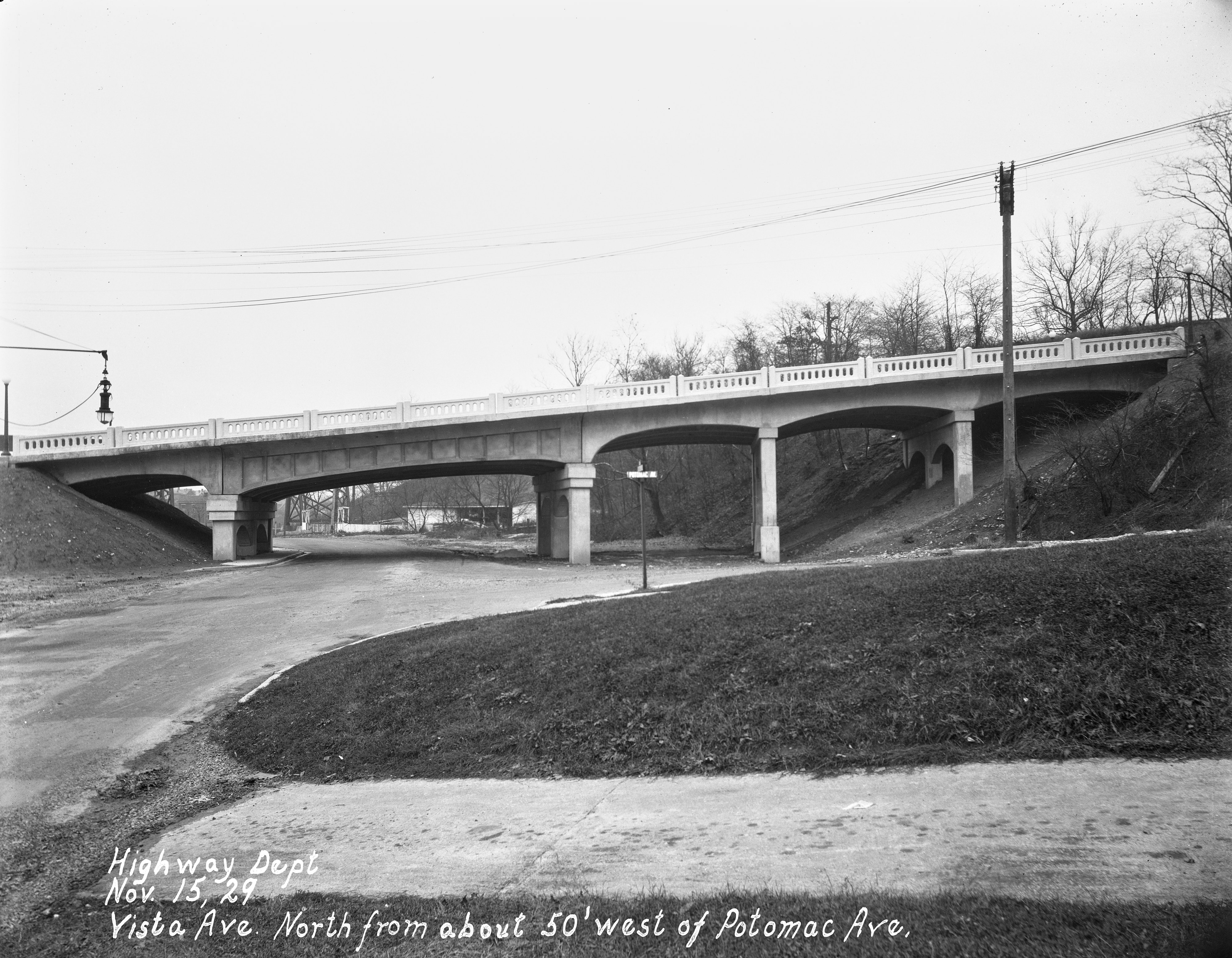 Historic photo of Duck Creek Road and the completed Vista Avenue overpass, looking northeast from Potomac Avenue. The base for the N&W Hyde Park Branch trestle can barely be seen under the main span of the overpass. All of this was obliterated for construction of I-71. From the University of Cincinnati Library Digital Resource Commons, Street Construction and Improvements collection.