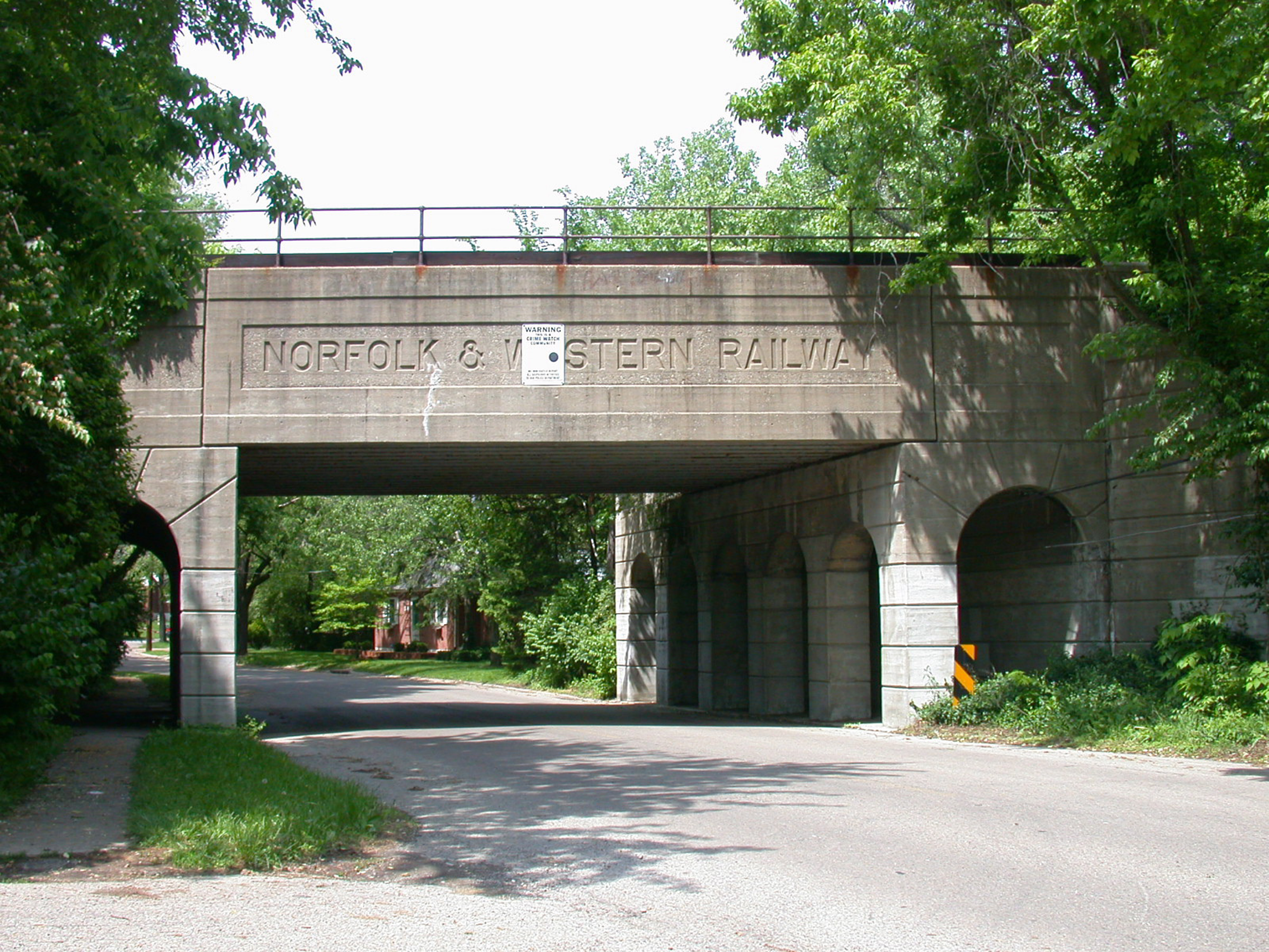 N&W Hyde Park Branch overpass at Grovedale Avenue in Hyde Park, looking north. This small residential subdivision is only accessible through this viaduct, built in 1929. This is a huge bridge for what was never more than a single track railway, with a deck able to easily accommodate two tracks, and additional abutments to the north allowing room for a third.