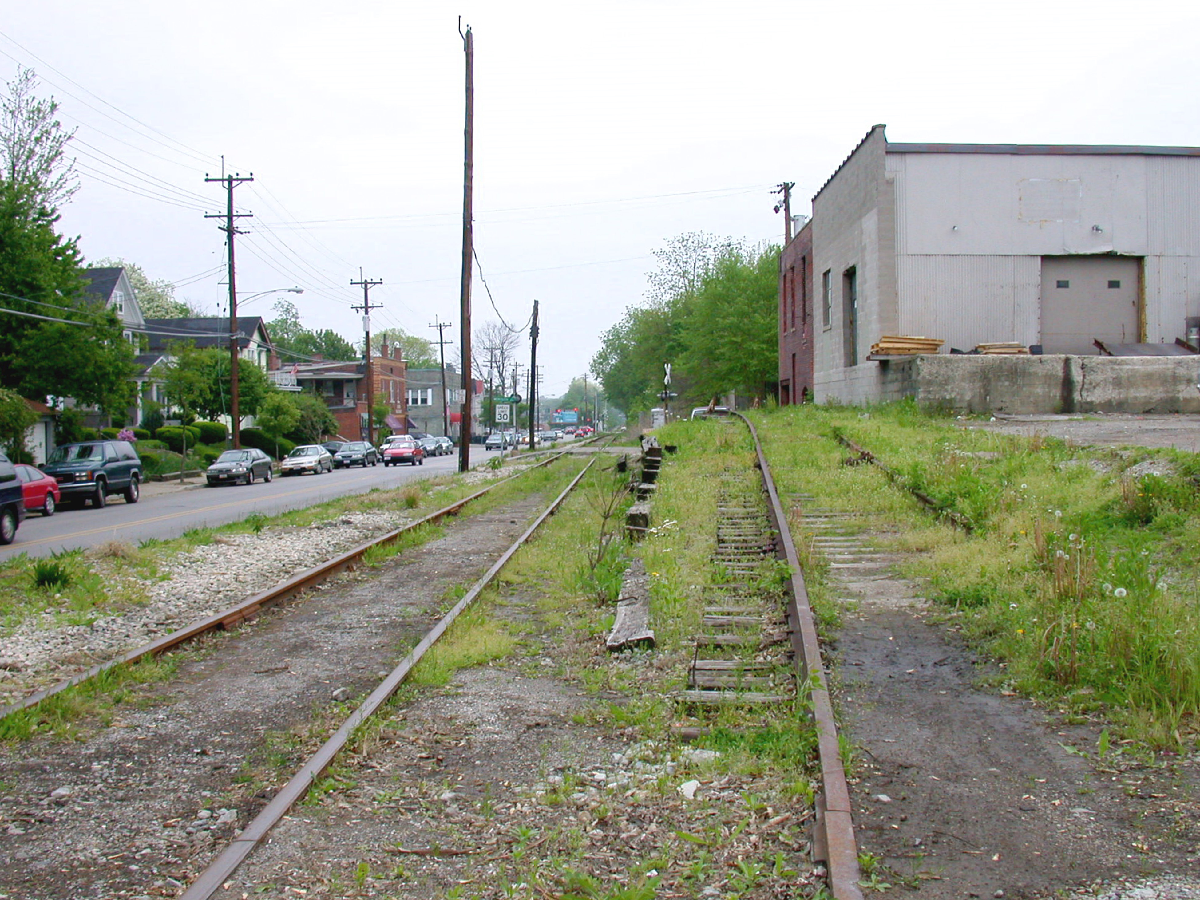 N&W Hyde Park Branch route along Wasson Road in Hyde Park, looking east from Hyde Park Place. The spur on the right continues from the last picture. The track has been removed for the Wasson Way bike path.