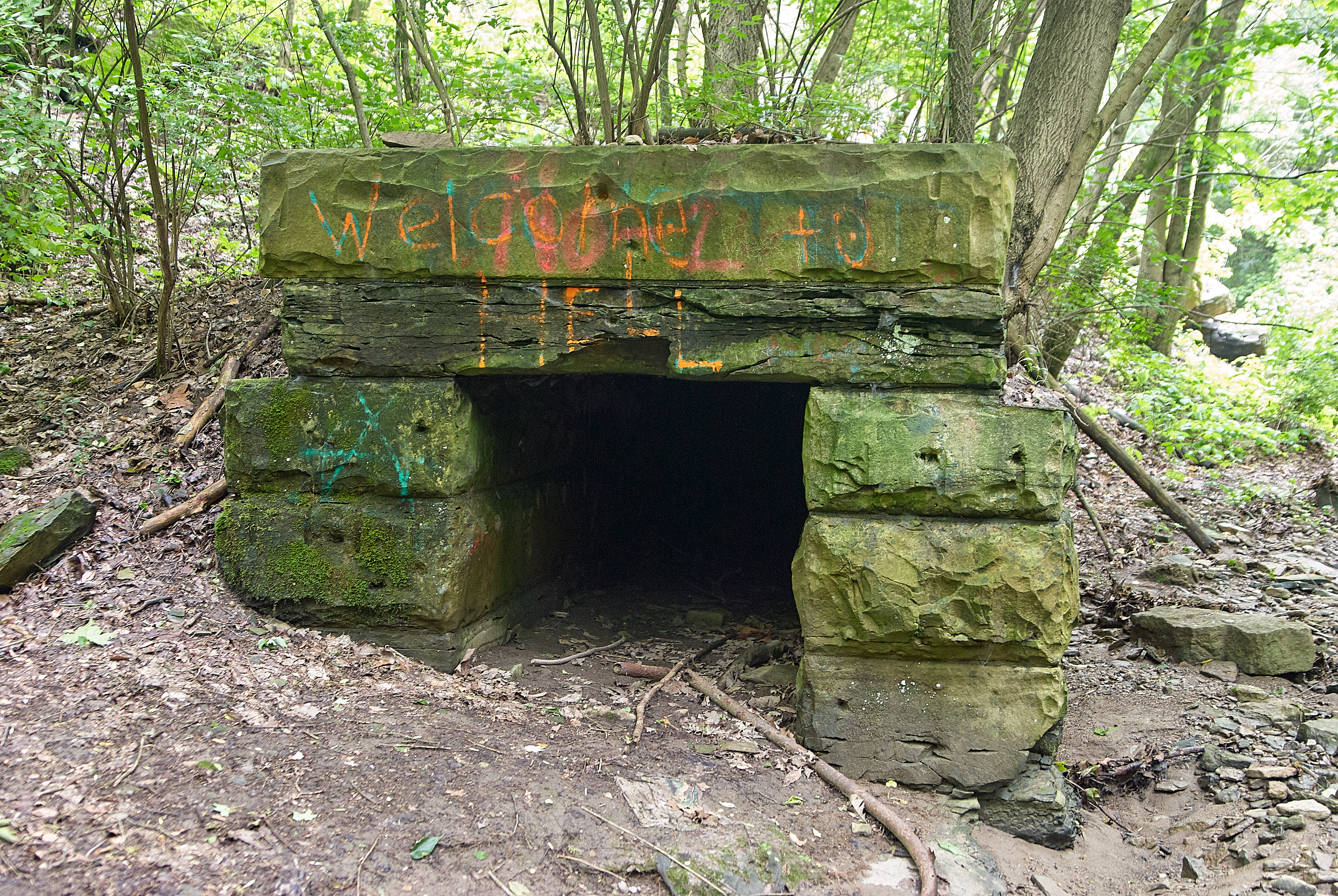 Abandoned creek channel under the N&W Hyde Park Branch trestle in Ault Park, looking west. Apparently "Hell" was a small tunnel to carry the creek under the trestle. Theoretically this would protect the trestle piers from undermining by the water. Unfortunately, the creek decided it didn't want to flow through here anymore, probably due to a blockage, and now flows around it to the right.