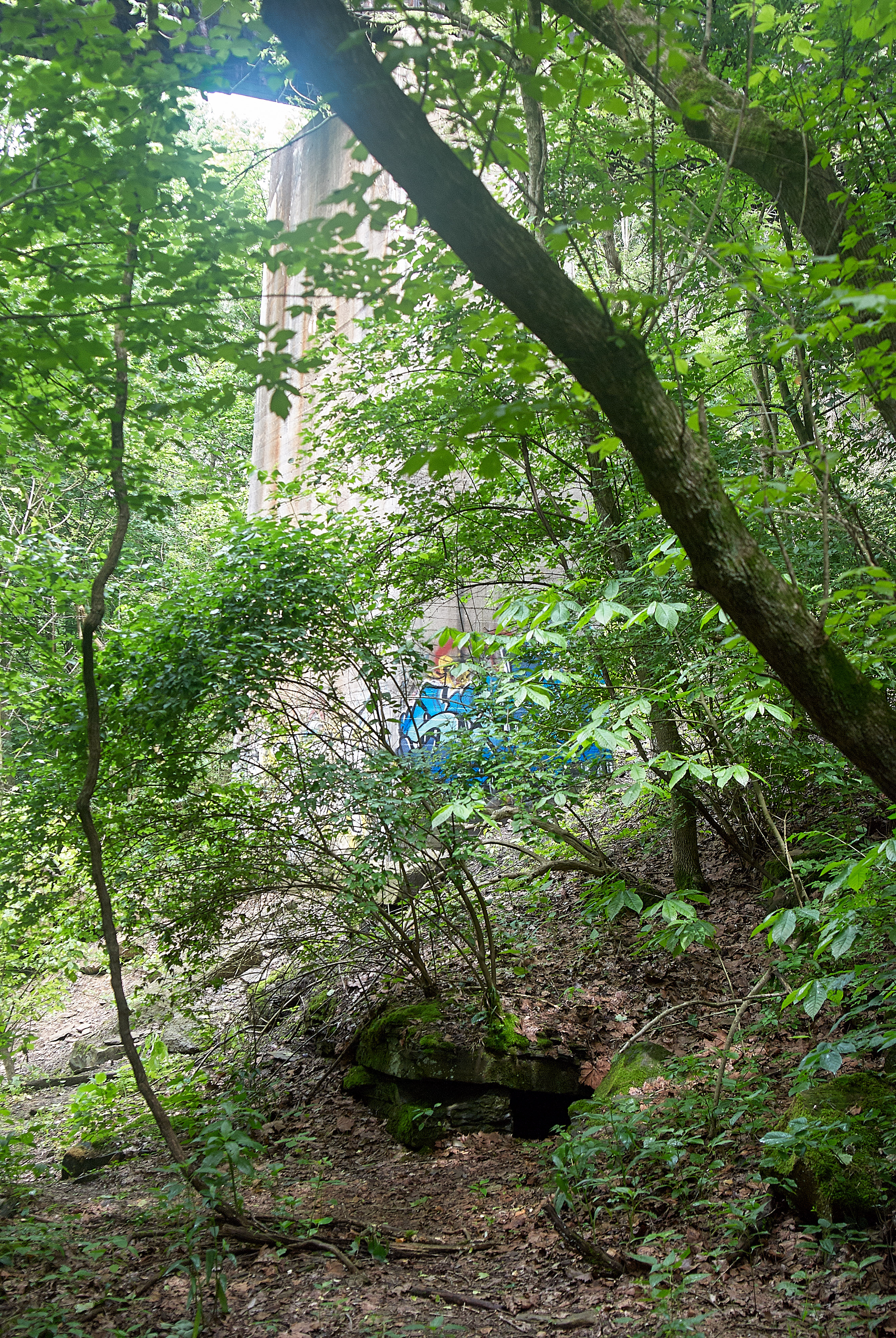 Upstream side of the abandoned creek channel under the N&W Hyde Park Branch trestle in Ault Park, looking east. Notice how landslides and vegetation have pushed the creek off to the left, away from this inlet.