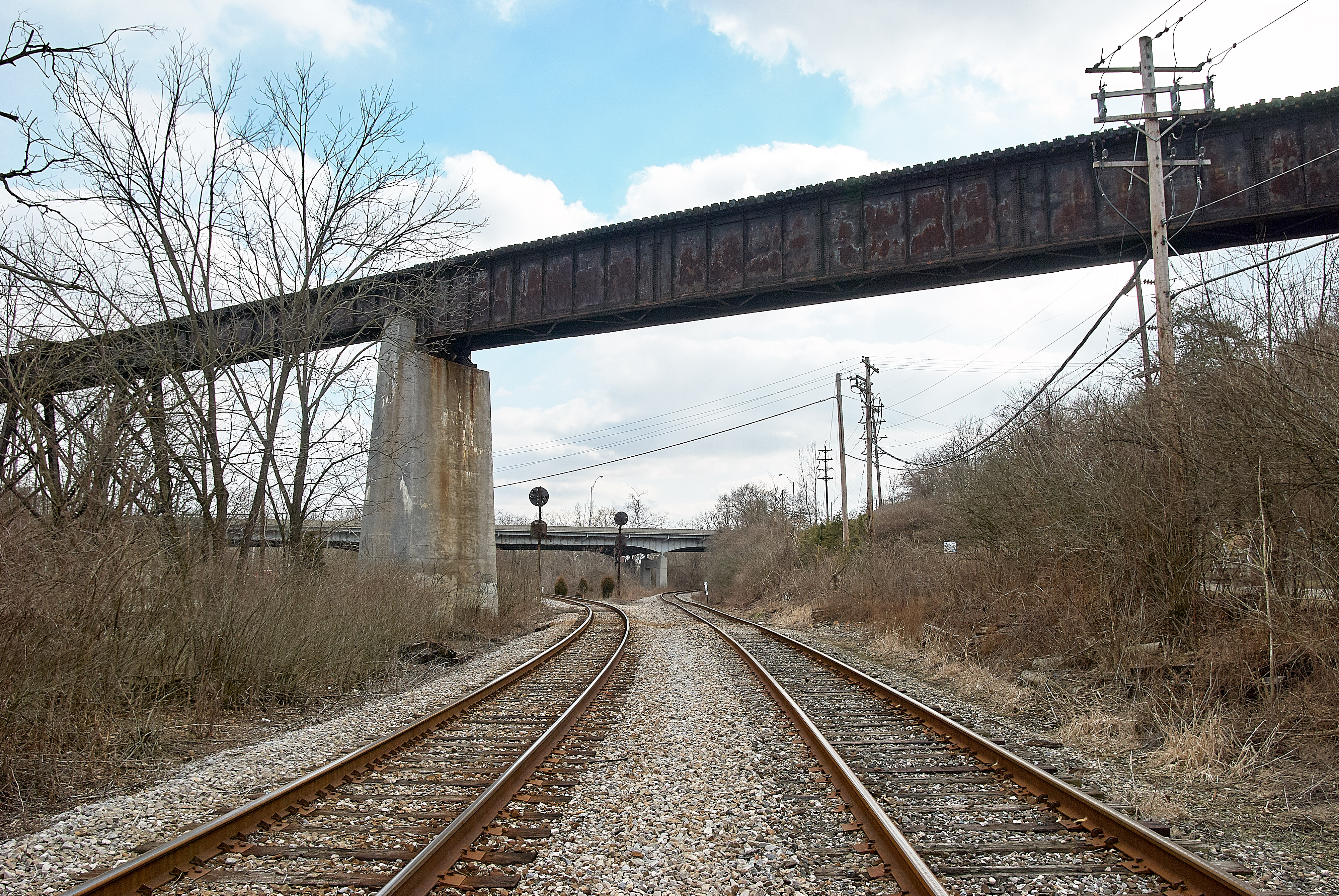 N&W Hyde Park Branch trestle over PRR Richmond Division tracks. Red Bank Road and Duck Creek are to the left. The power lines on the right follow Old Red Bank Road. Columbia Parkway is on the bridge in the distance.