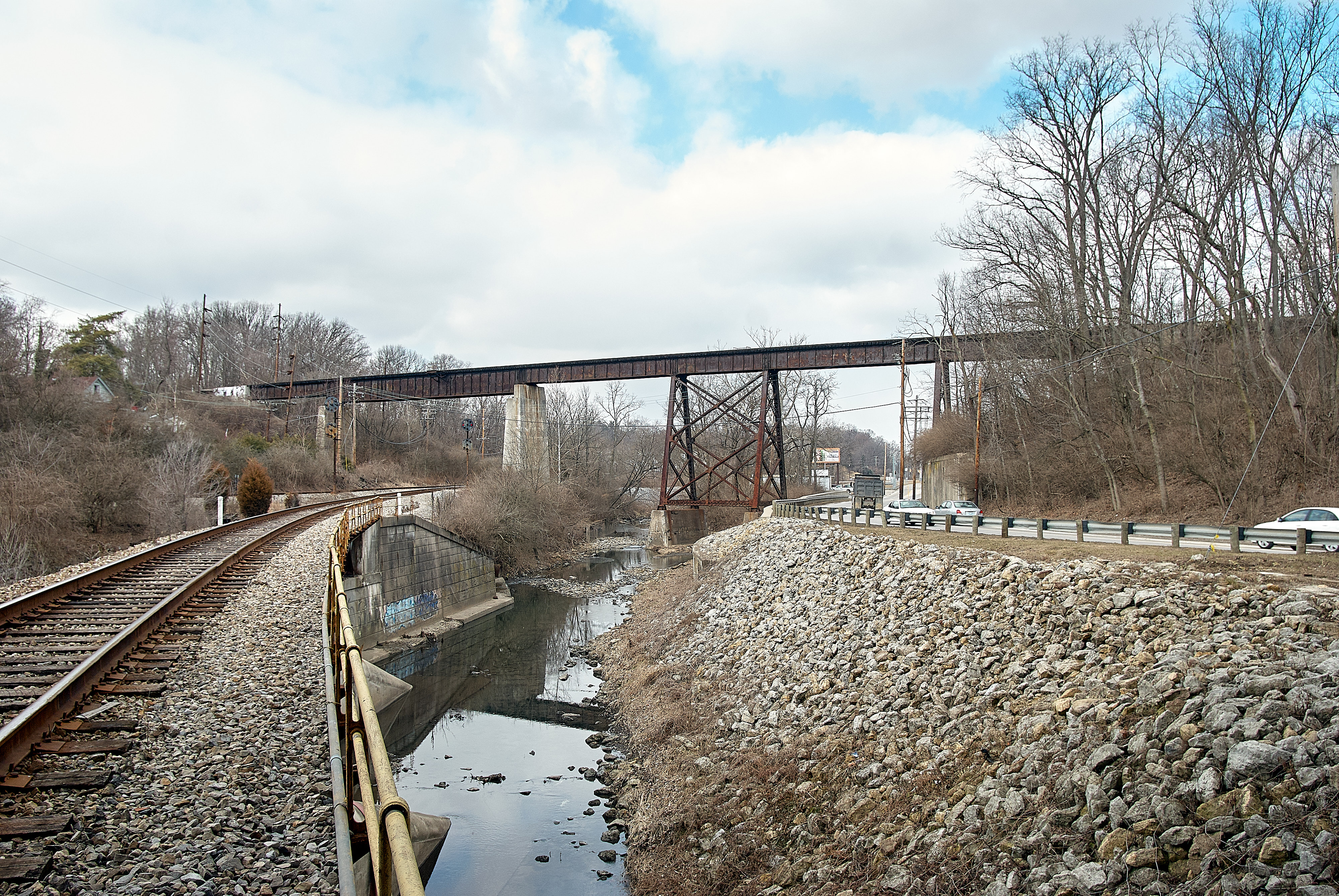 N&W Hyde Park Branch trestle over PRR Richmond Branch tracks, Duck Creek, and Red Bank Road, looking northwest. The bridge on the left over Duck Creek was built in 1939, the trestle in the distance probably dates from the 1910's.