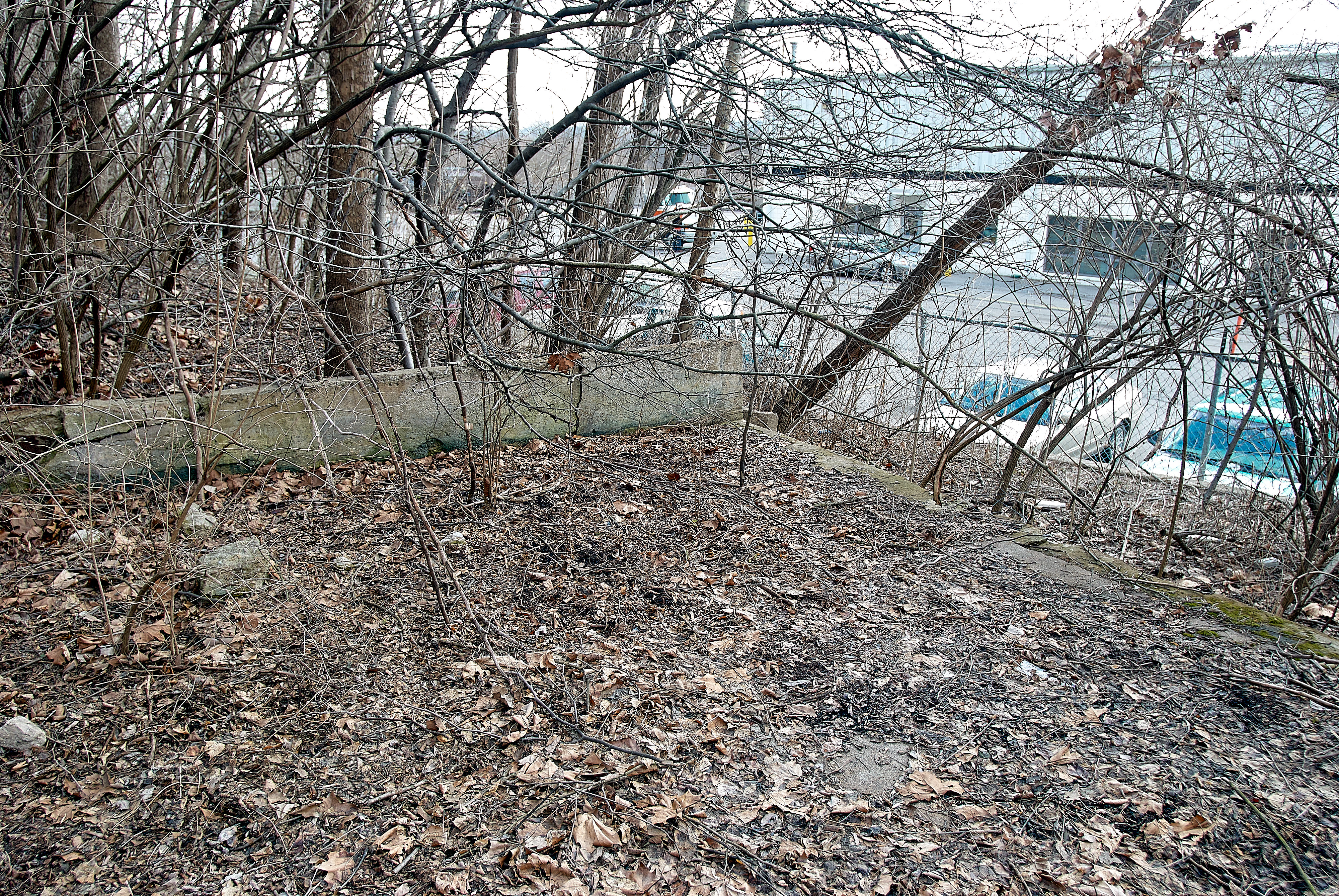 Abandoned building foundations at the west end of Clare Yard, looking southeast. The current yard's facilities are visible through the trees.