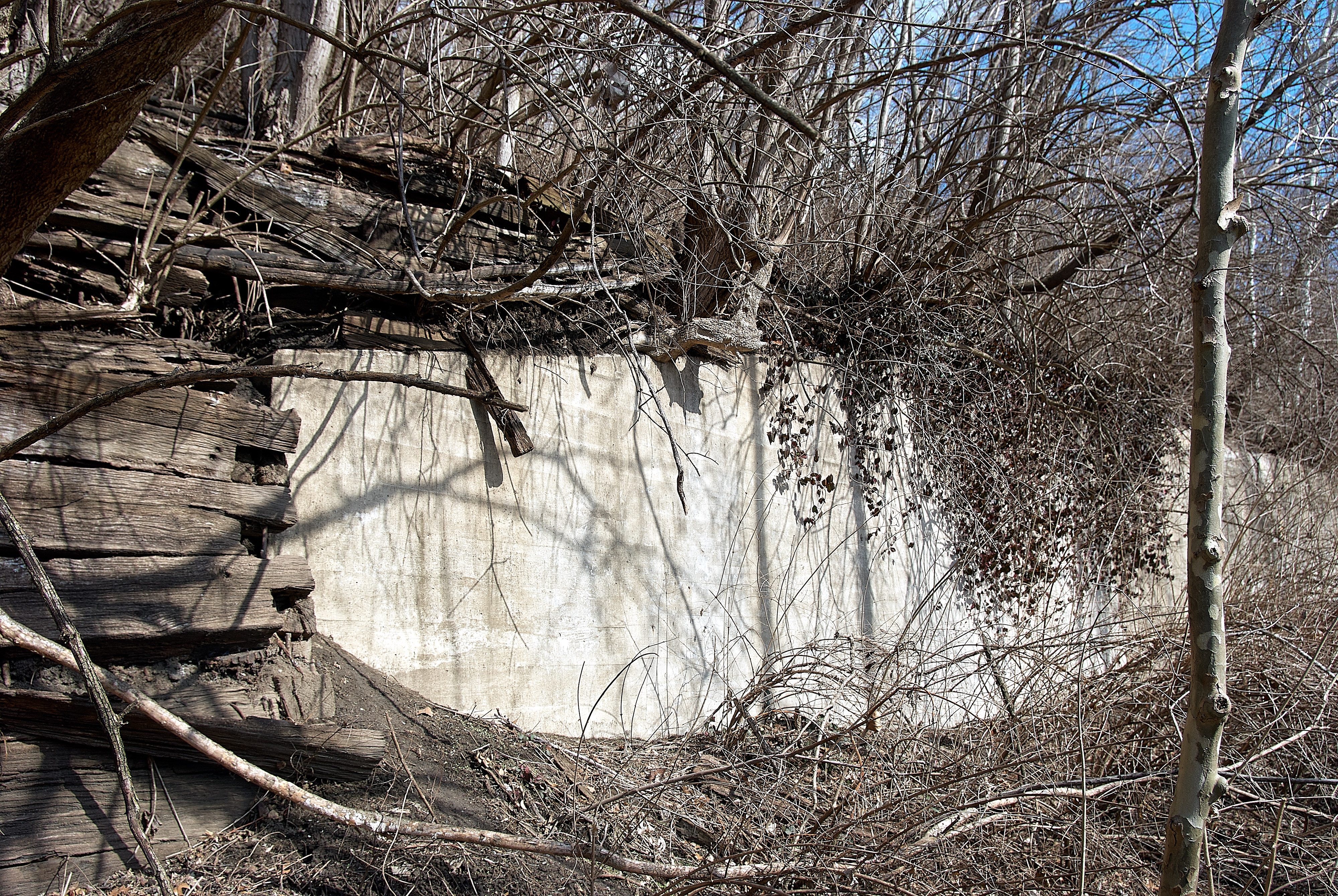 Retaining walls along the north side of Clare Yard, looking northeast from the foot of the hill.