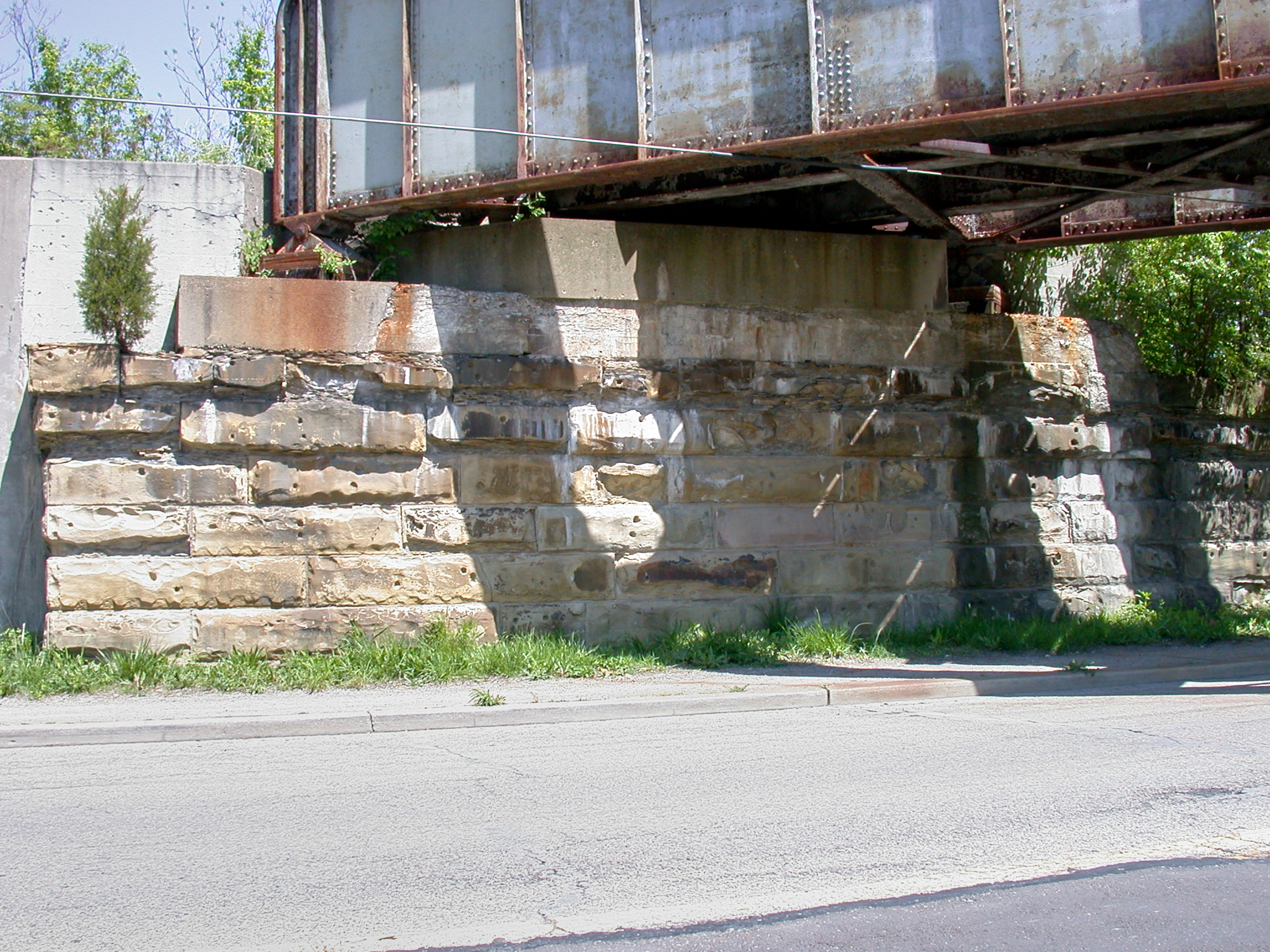 N&W overpass at Tennessee Avenue in Bond Hill, looking north. This old stone work, also present on the PRR line along Eastern Avenue, indicates that there has been a viaduct here for nearly 100 years.
