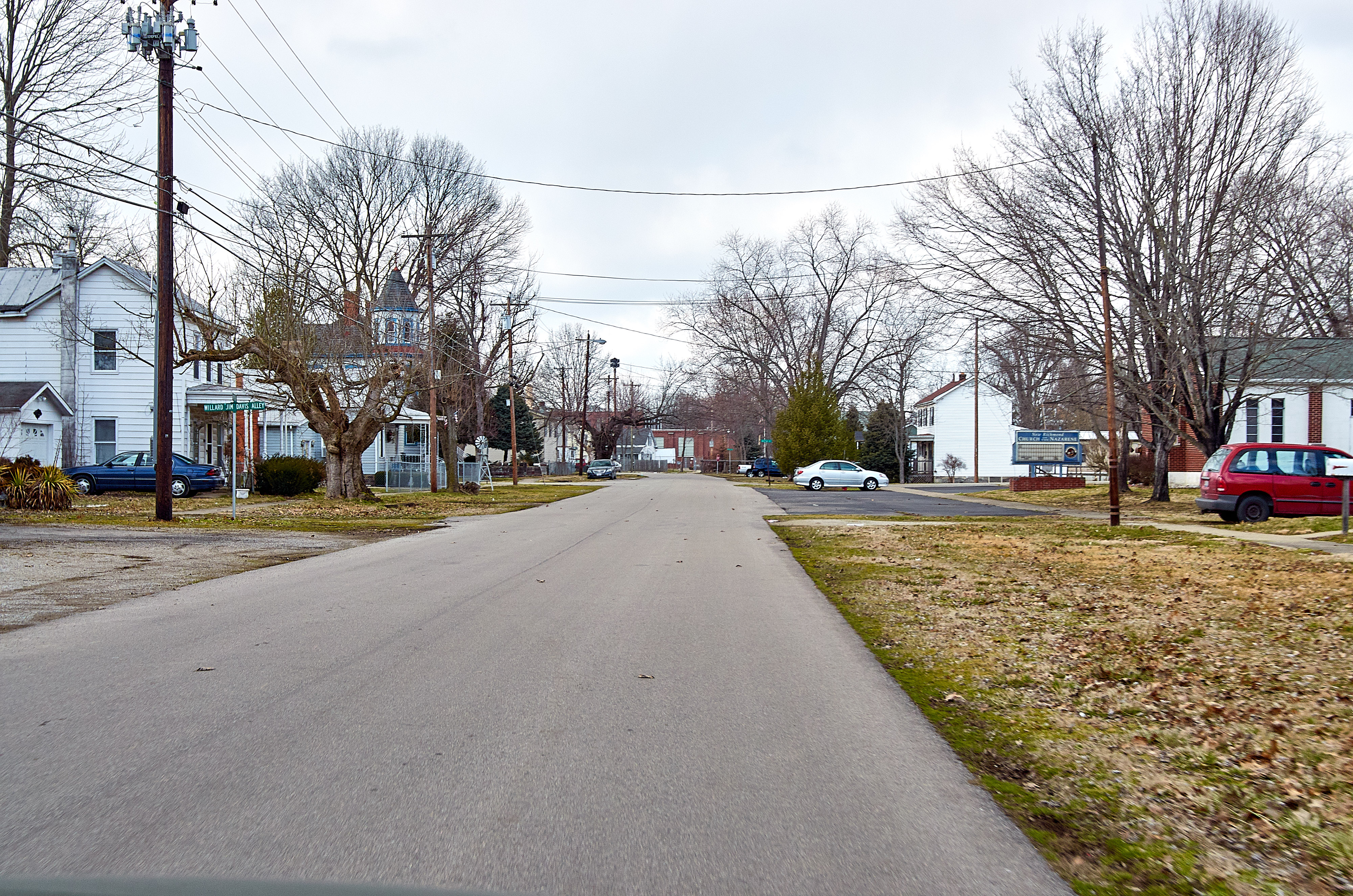 Cincinnati & Eastern New Richmond Branch route approaching Plenty Street along Hamilton Street in New Richmond, looking northwest.