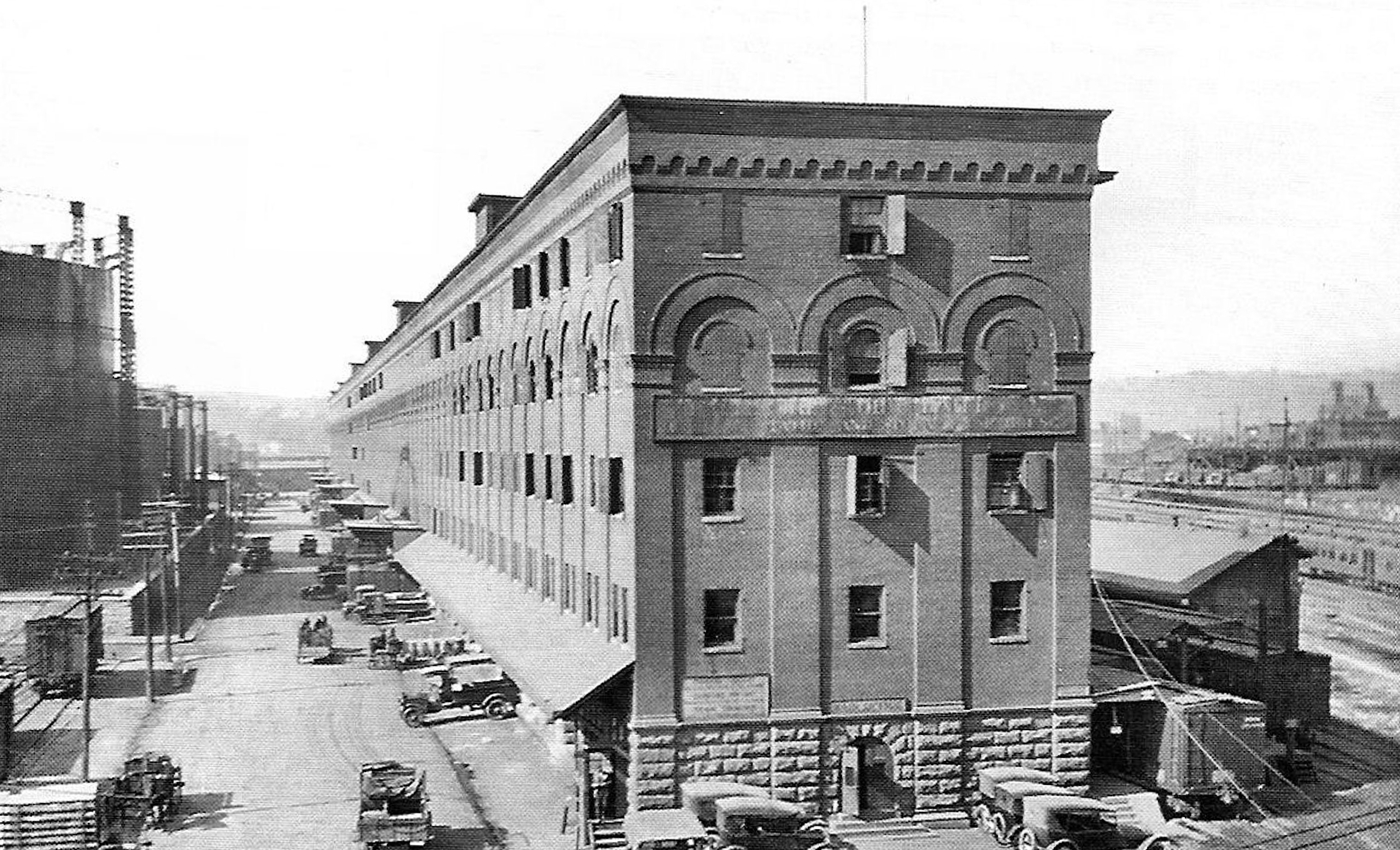 Historic photo of the B&O freight warehouse, now Longworth Hall, looking west along 2nd Street, now Pete Rose Way. This end of the building was demolished and partially rebuilt to allow the I-75 Brent Spence Bridge to pass over it. The immense size of the building was in part because it housed significant produce storage areas with early mechanical cooling systems.