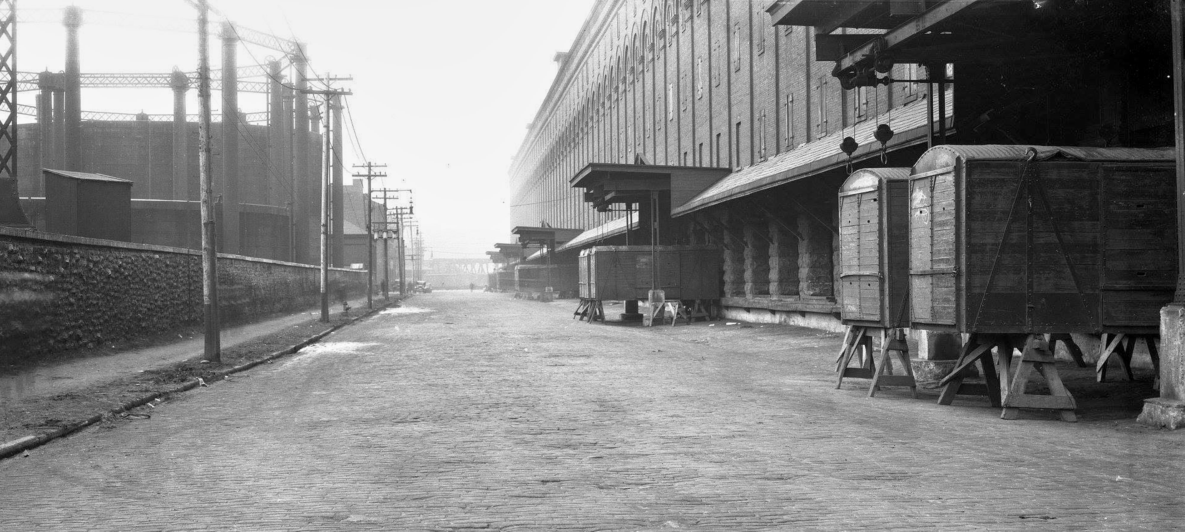 Historic photo of the B&O warehouse, now Longworth Hall, at 2nd Street, now Pete Rose Way, in 1920, looking west.