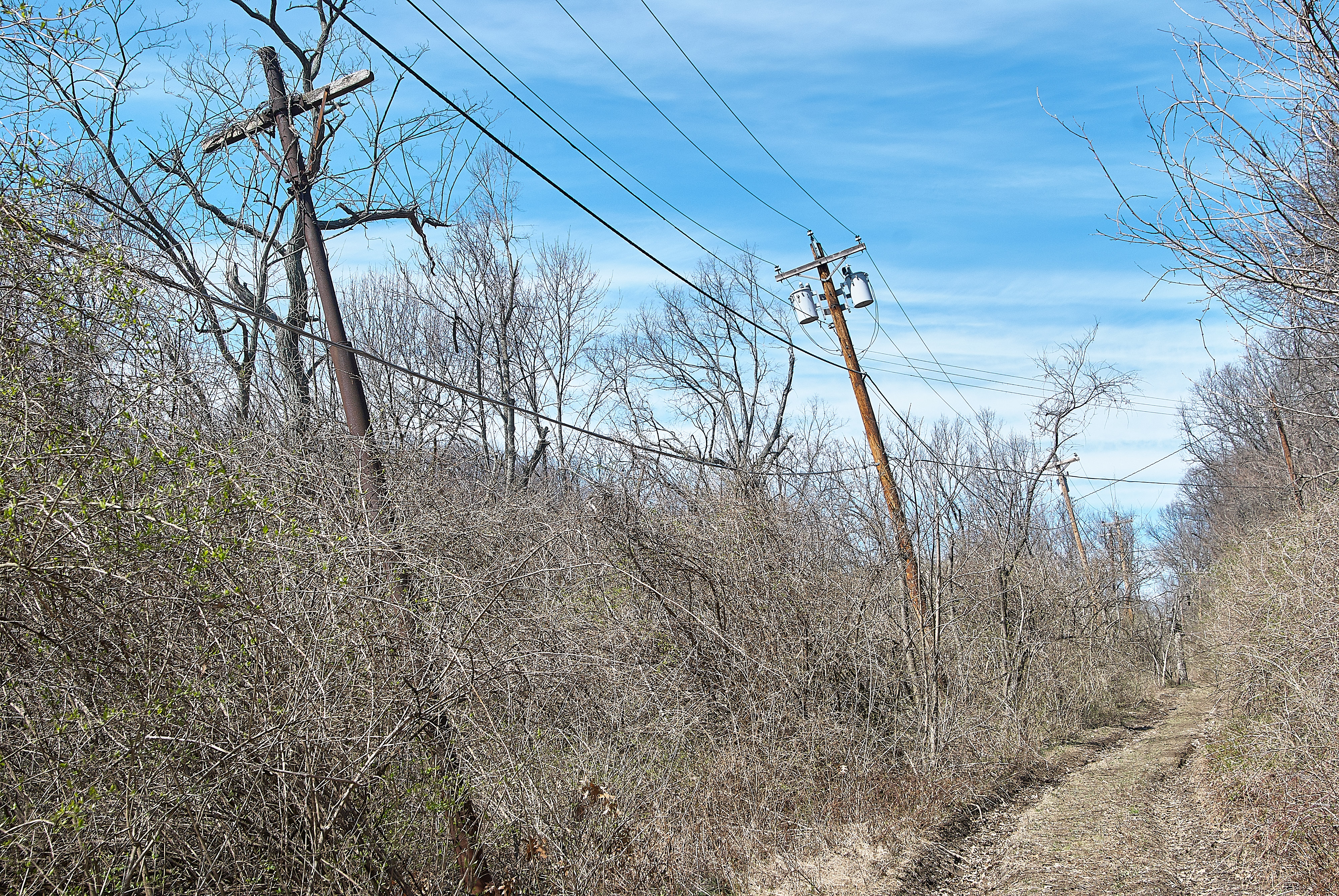 More leaning poles along Torrence Road, near where the road picks up again before Columbia Pakway. There have been some landslides below here, covering the sidewalk along the parkway with mud and debris.