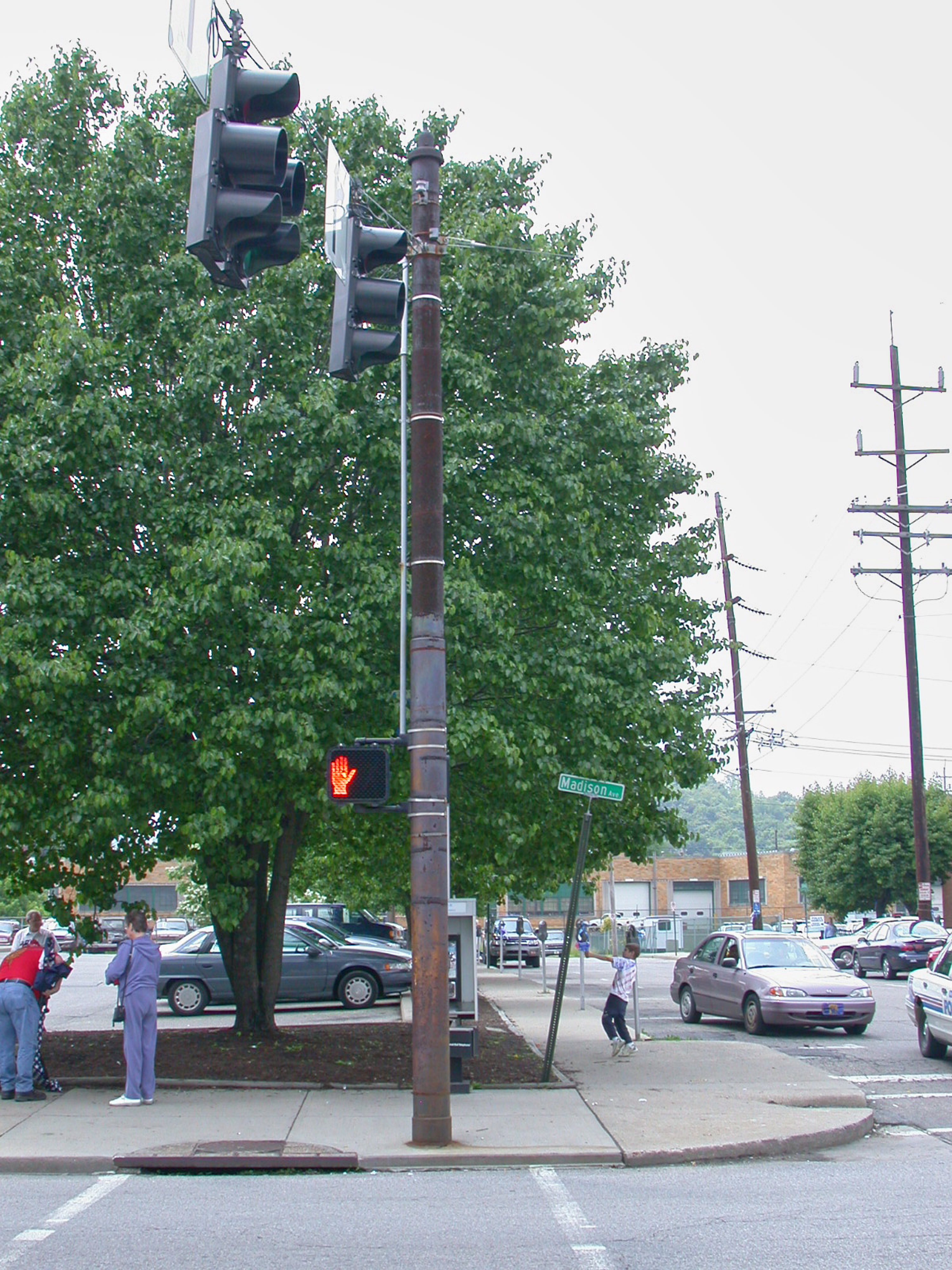 A large trolley pole on the corner of Madison Avenue and 20th Street in Covington, looking west. This pole is extra fat because it was supporting overhead wires for a curved section of track (turning from 20th onto Madison). Because of the high tension necessary to maintain a smooth curve in the wires, larger poles were used. There were also carbarns at this site as well.