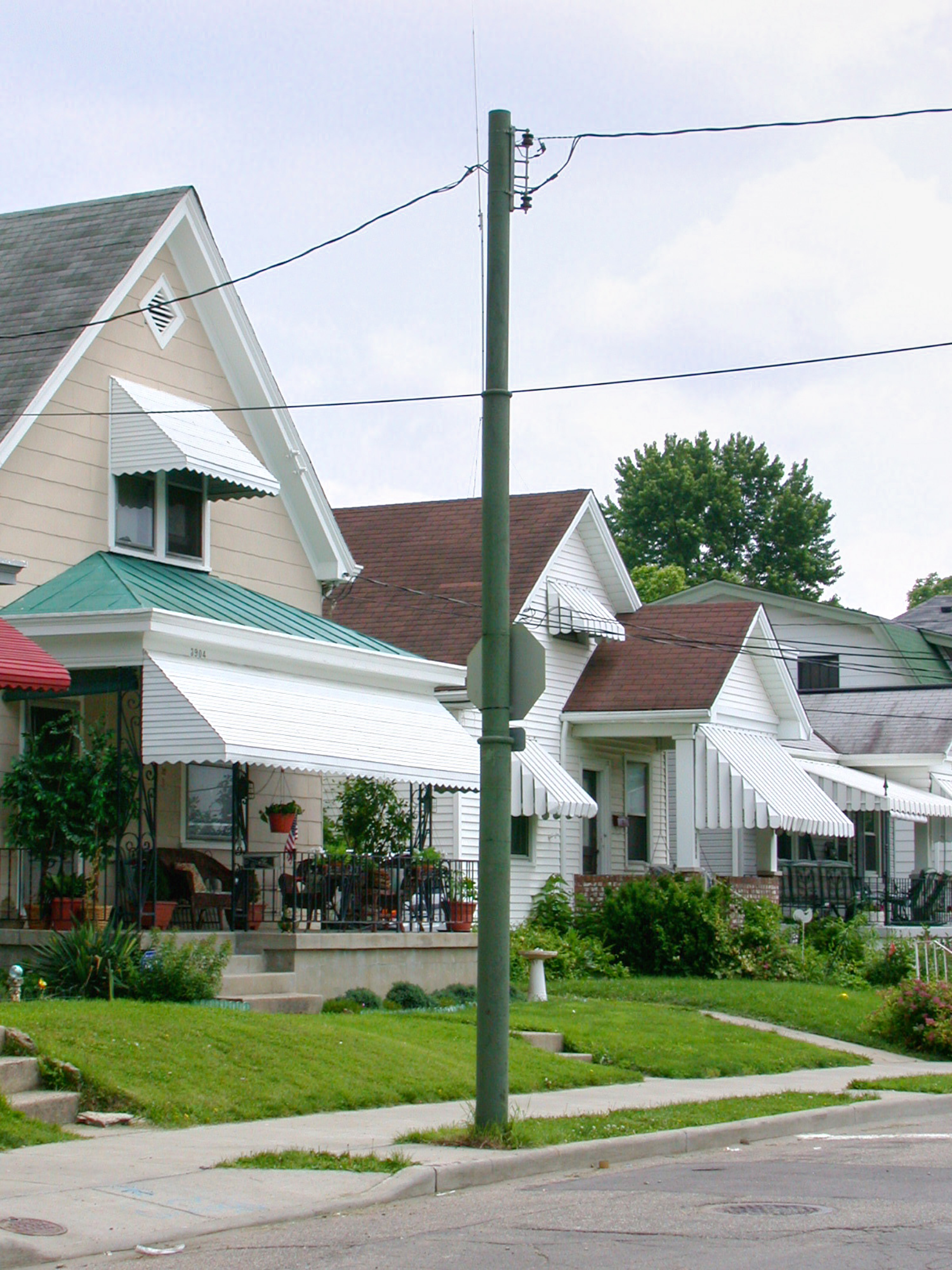 A trolley pole on Huntington Avenue in Rosedale, looking southeast. Note that there's an extra rounded moulding at each of the telescoping sections of the pole. This is much more common in Kentucky than in Cincinnati.