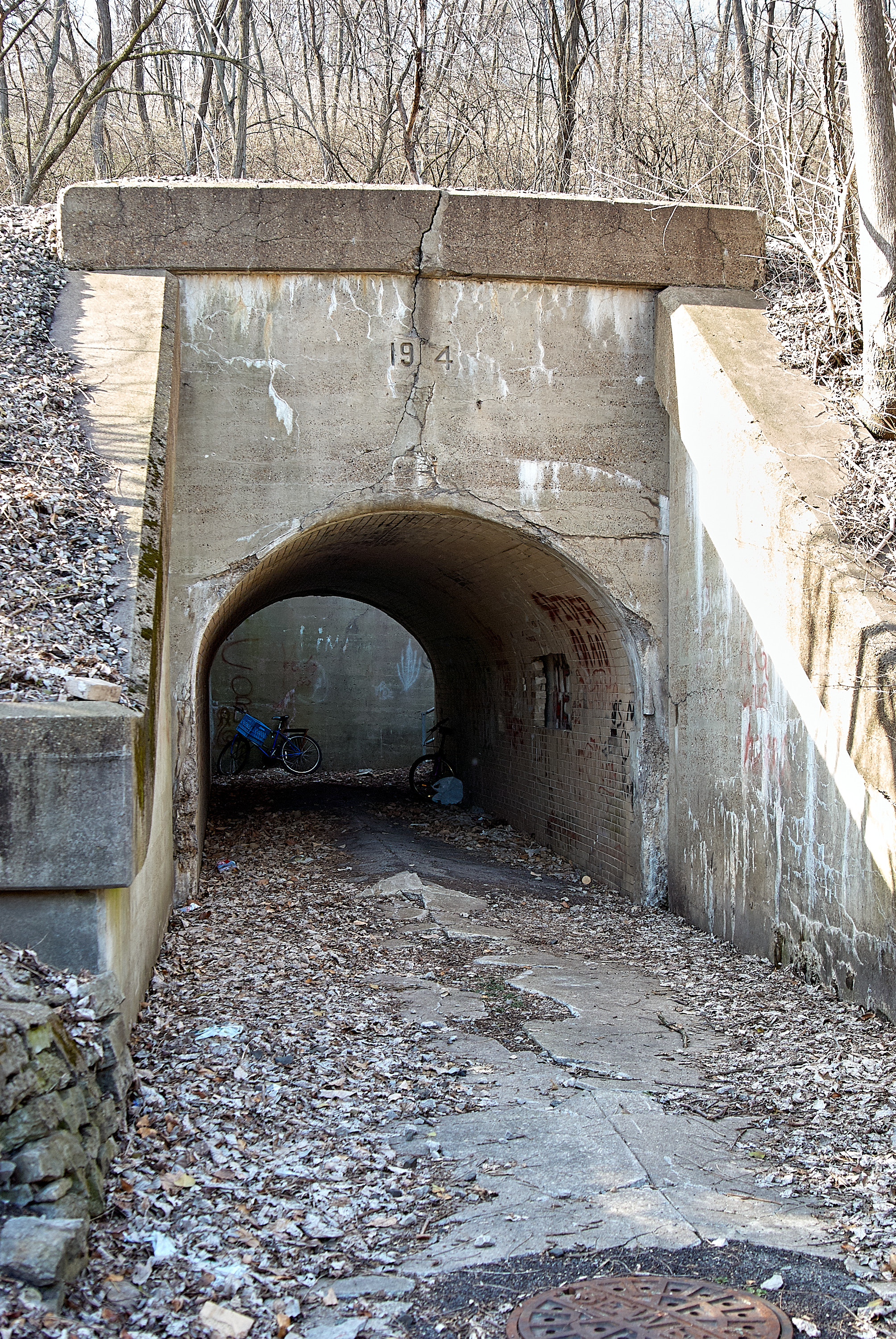 The entrance to the abandoned pedestrian underpass at the Indiana & Ohio Oasis, former Pennsylvania/Little Miami Railroad in the East End, looking north. The date is 1914, same as the nearby Eastern Avenue/Riverside Drive underpass.