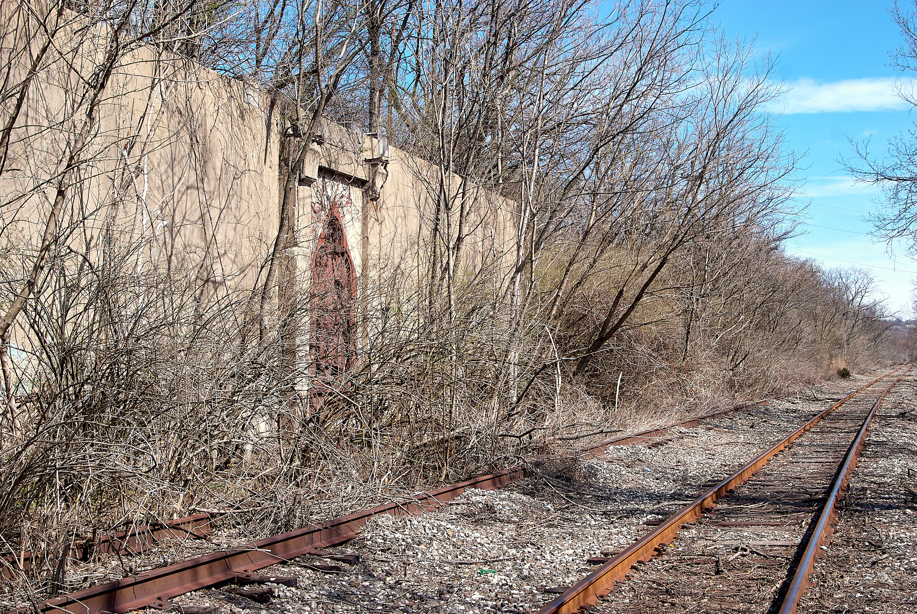 Looking at the wall at the left of the Torrence Road Station, looking east. The bridge over the tracks rested on the piers in the center of this wall, over the red mural.