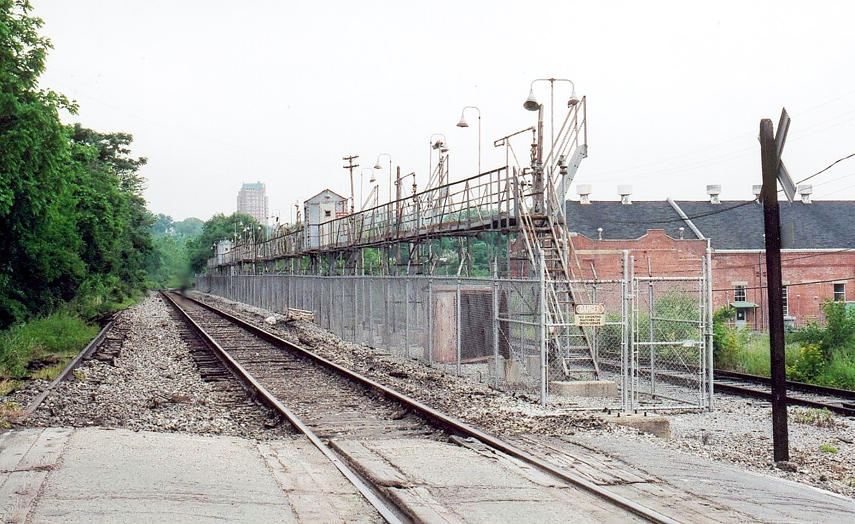 Oil platform above Eastern Avenue on the Indiana & Ohio Oasis, former Pennsylvania/Little Miami Railroad in May, 2004. St. Andrews Street is in the foreground and intersects with Riverside Drive just to the right of the photo. This was once the western edge of the Little Miami/PRR's Pendleton yard, and also the eastern border of the City and the Fulton neighborhood before Pendleton was annexed. This structure no longer exists. The CG&E building on the right was pat of a much larger East End Gas Works facility that stretched from that building at Pittsburgh Street back to St. Andrews. Photo by Mike Oestreich.