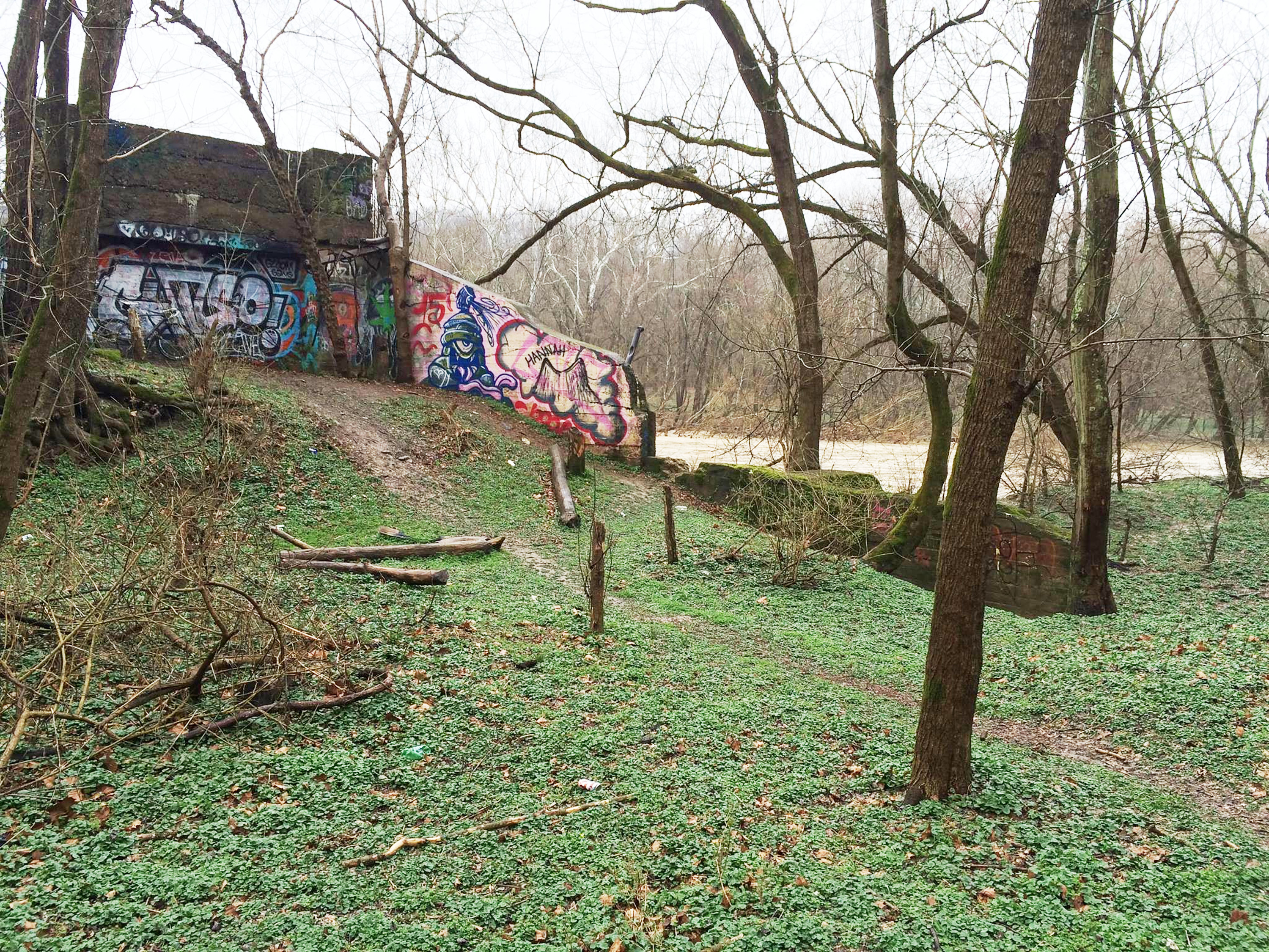 Bridge abutment for the Pennsylvania/Little Miami Railroad spur at Kings Mills. This freight spur crossed the river about half way between the Peters Cartridge factory and Middletown Junction to serve industries that used to be on the west bank of the river.