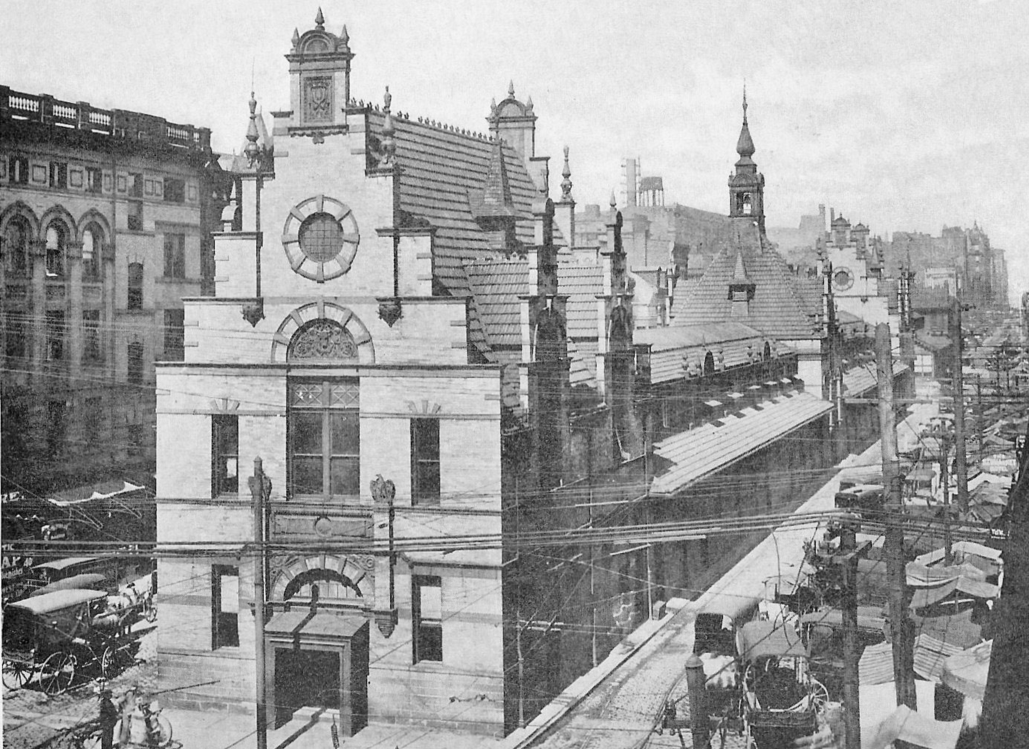 An old view of the 6th Street Market showing a mess of overhead utilities and streetcar tracks sliding along the side of the building. This view is looking east along 6th Street from Central Avenue, now on the north side of the convention center. This building designed by Samuel Hanaford was opened in 1896, replacing the one from the last photo.
