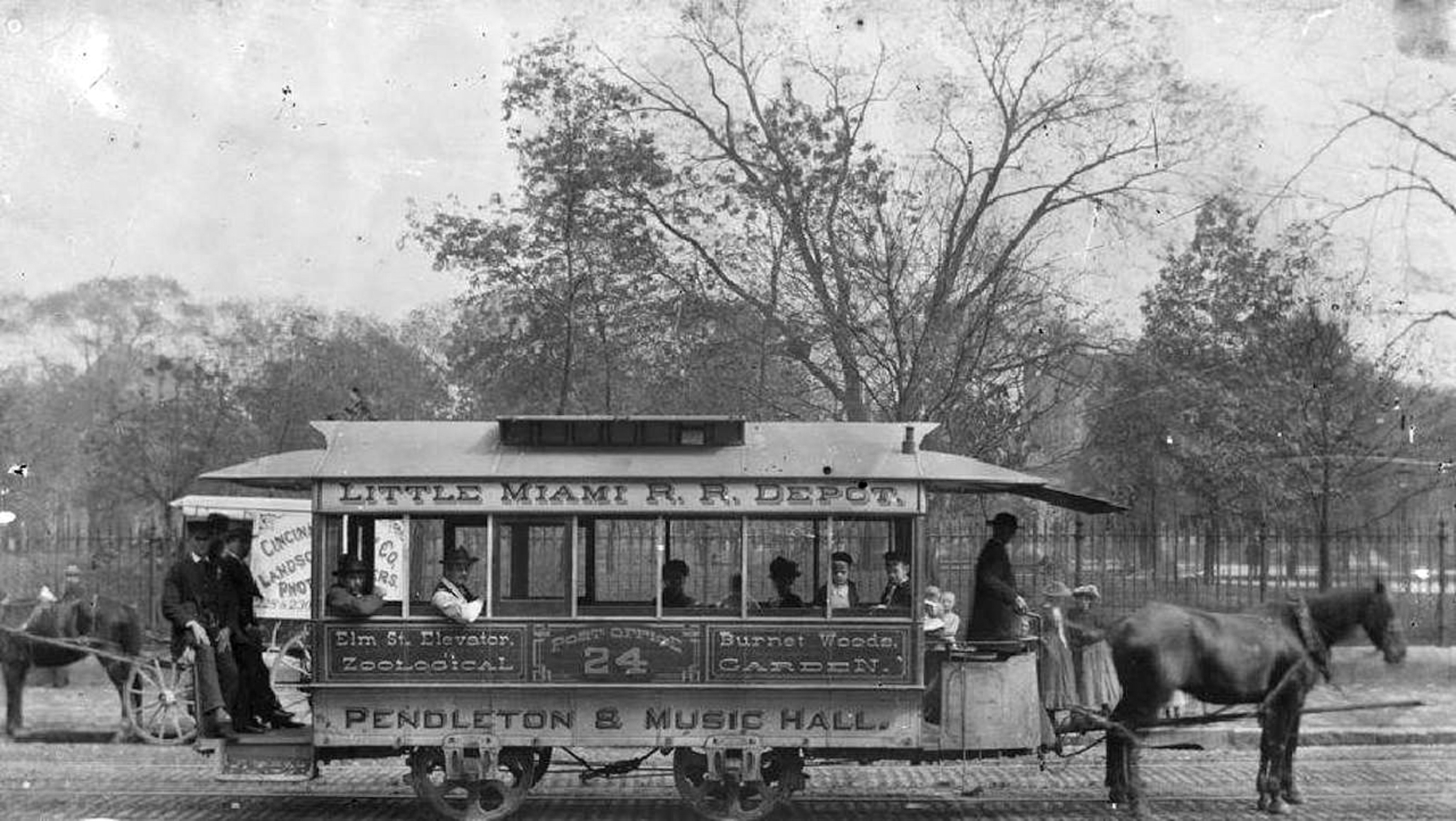 Historic photo of a horsecar on Elm Street at Washington Park, looking east into Washington Park from in front of Music Hall.