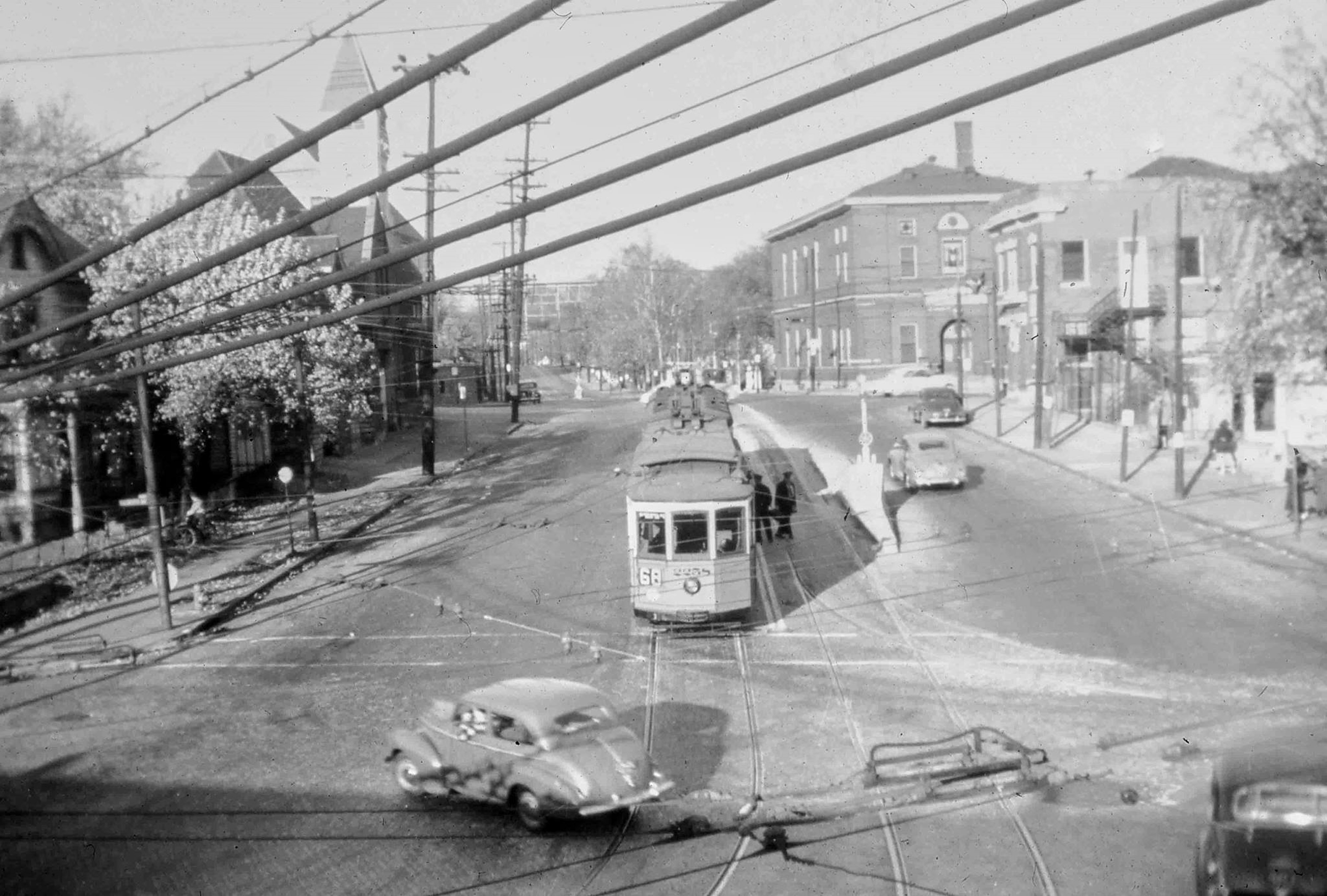 Historic photo of Delta Avenue at Eastern Avenue in Columbia-Tusculum, looking north from the Pennsylvania/Little Miami Railroad overpass towards Columbia Parkway.