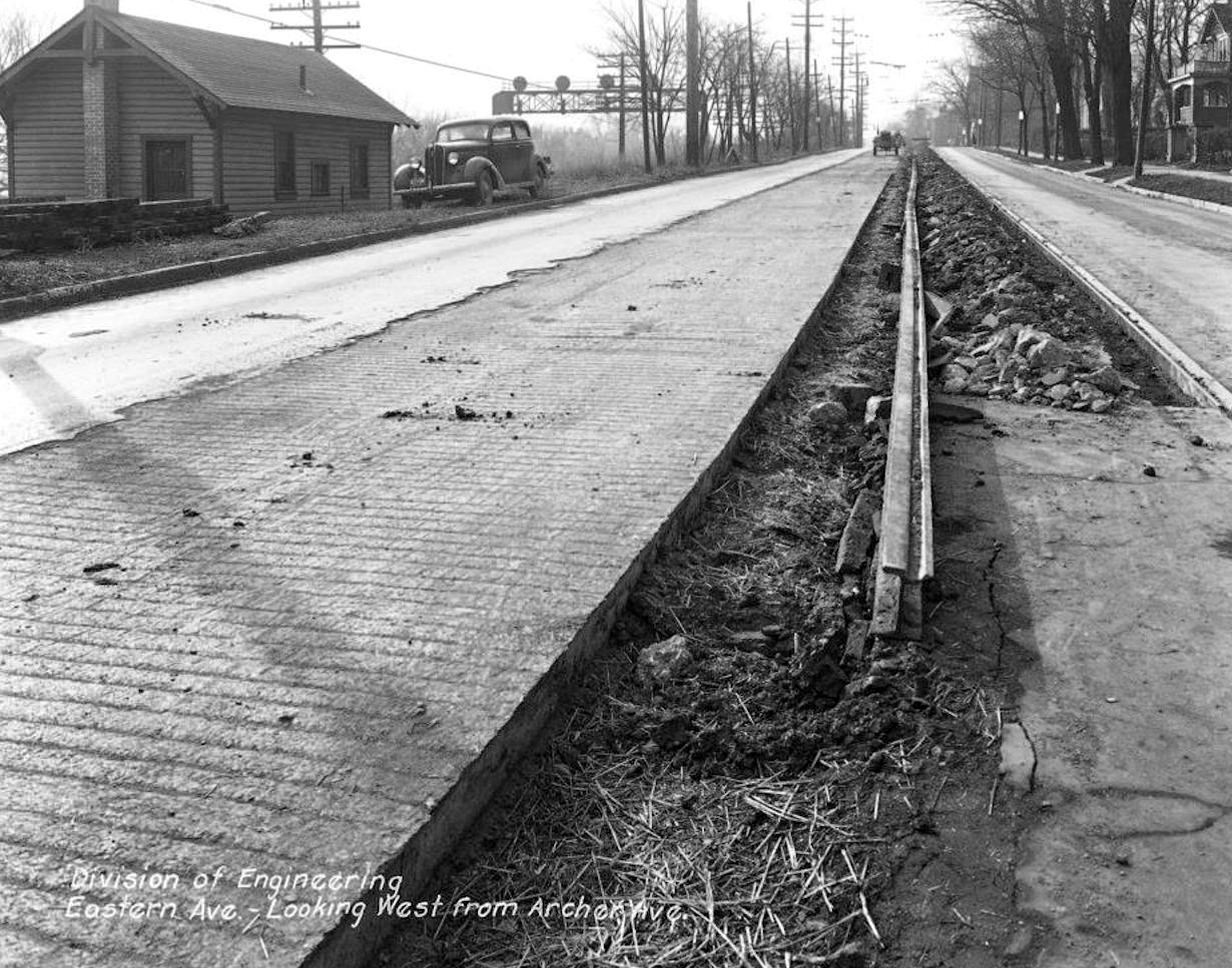 Historic photo of streetcar and road reconstruction at Eastern and Archer in 1931, looking southwest down Eastern Avenue. The Pennsylvania/Little Miami Railroad's Rendcomb Junction station is at the left.