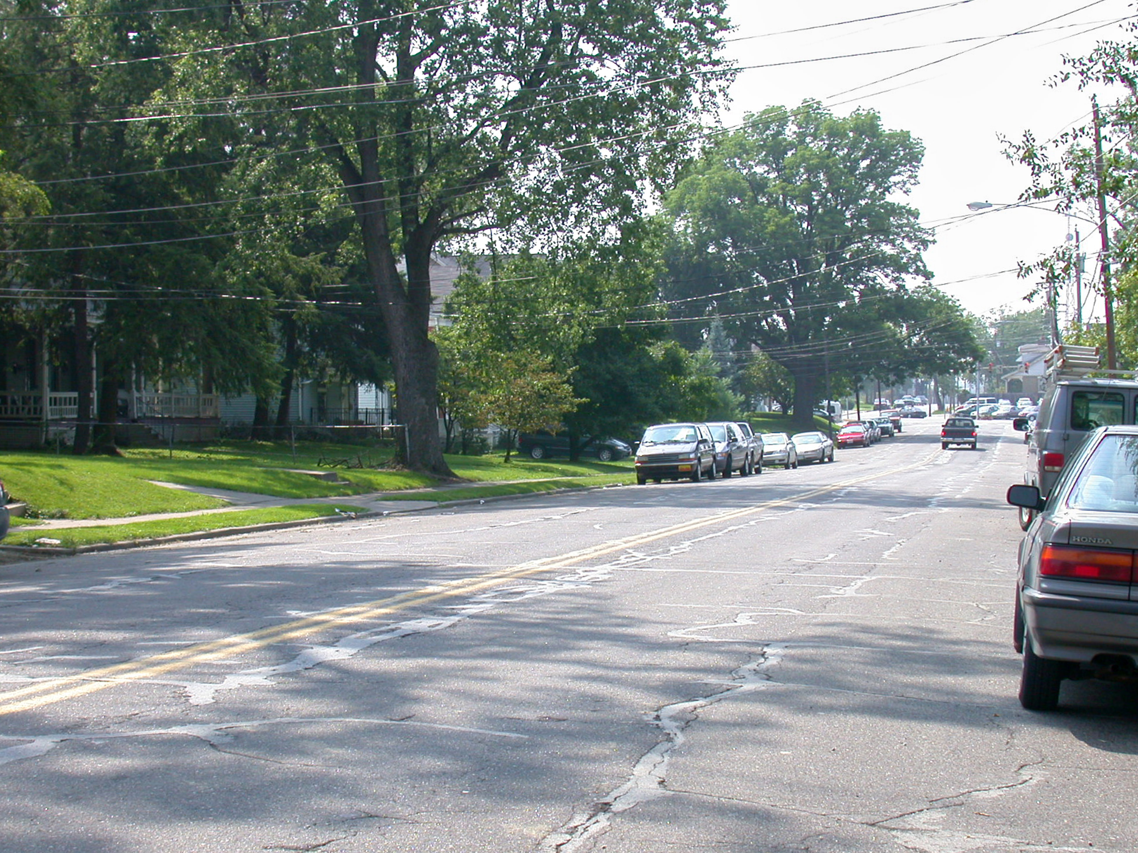 Cracks in the street reveal buried tracks on Cleneay Avenue in Norwood, looking west. Montgomery Road is in the distance. This road has since been repaved.