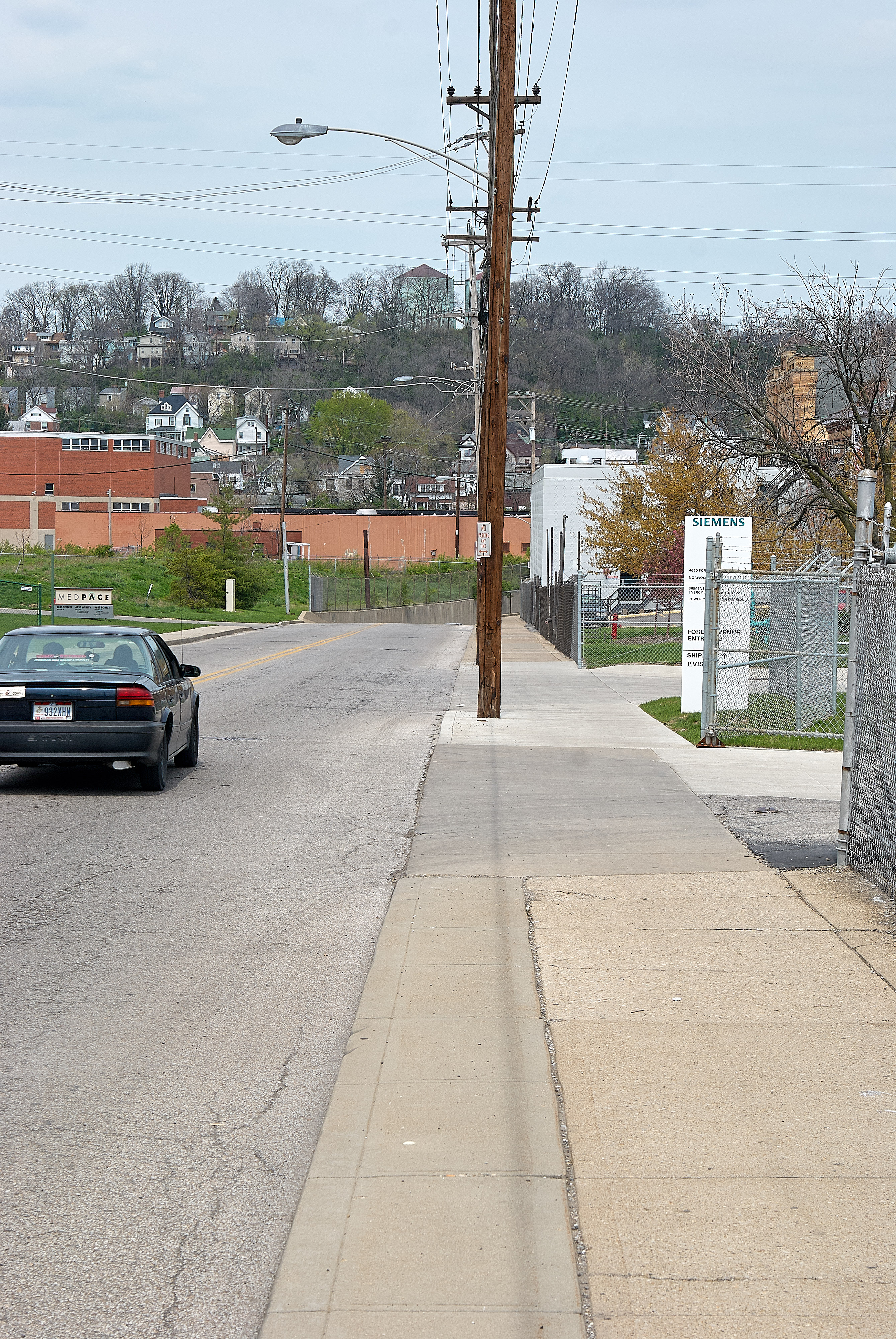 The other end of the private ROW north of Park Avenue in Norwood, looking north along Forest Avenue. While it's not really visible here, there's a slight bulge in the pavement at this driveway, immediately to the right of the car, which marks where the streetcar line returned to the road.