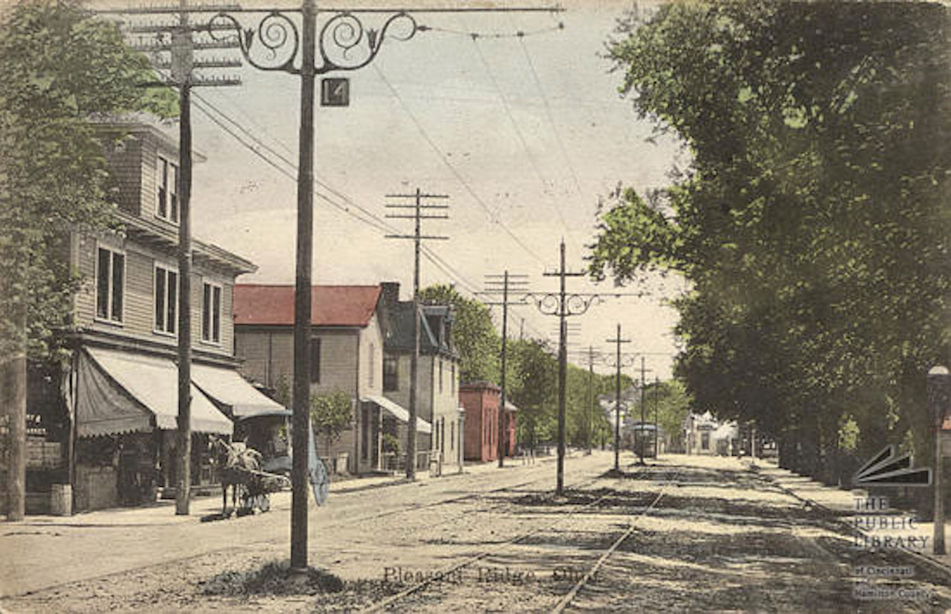 Historic postcard of IR&T Rapid Railway tracks and decorative poles on Montgomery Road in Pleasant Ridge. Poles like this were relatively uncommon in the area, except in Ft. Thomas, KY.