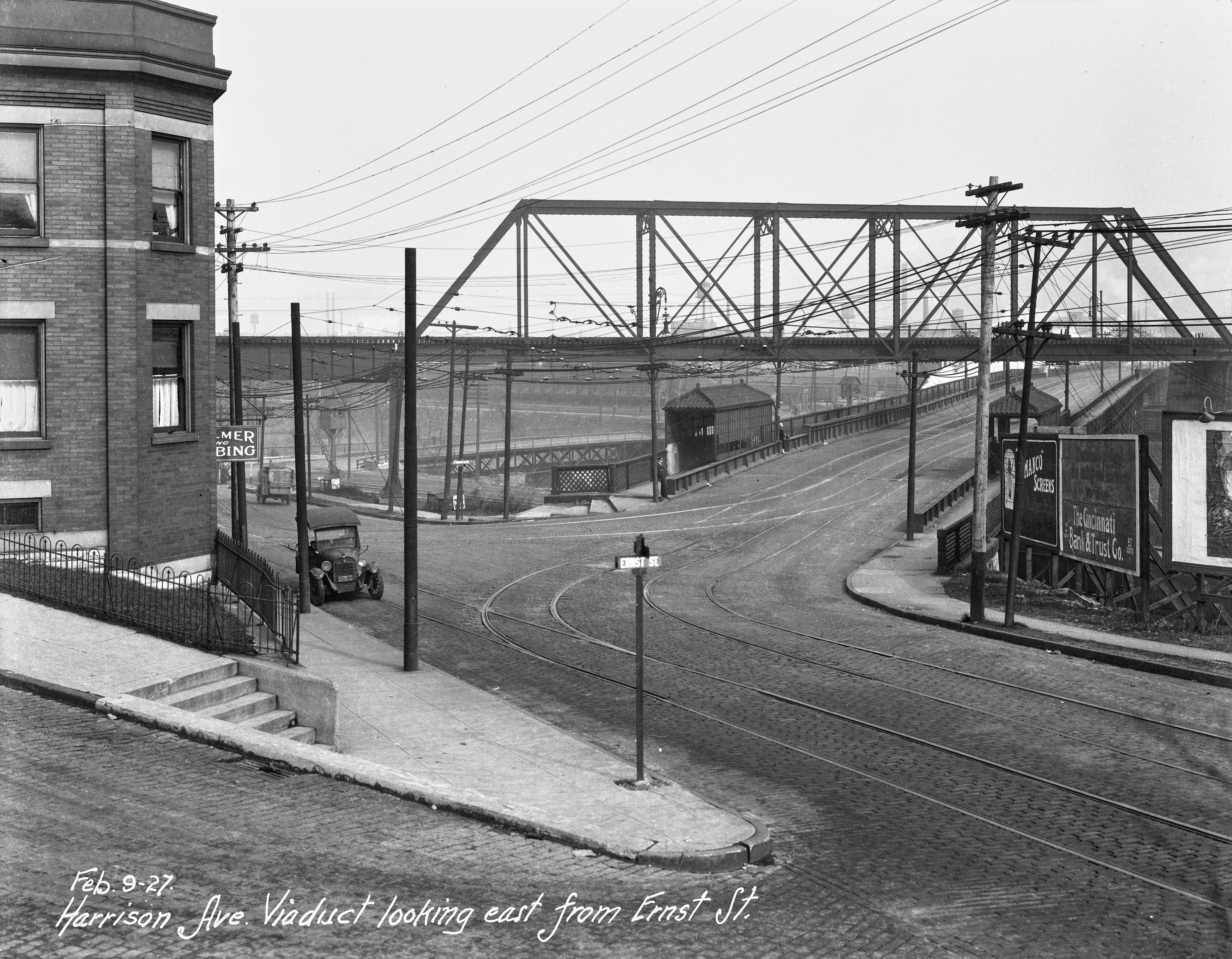 Historic view of the west end of the Harrison Avenue Viaduct and State Avenue from Ernst Street in South Fairmount, looking north northeast. The old Harrison Avenue bridge over Mill Creek and a guard tower for the CH&D Railroad can be seen in the distance. The trestle overhead is for the C&O of Indiana. From the University of Cincinnati Library Digital Resource Commons, Street Construction and Improvements collection.