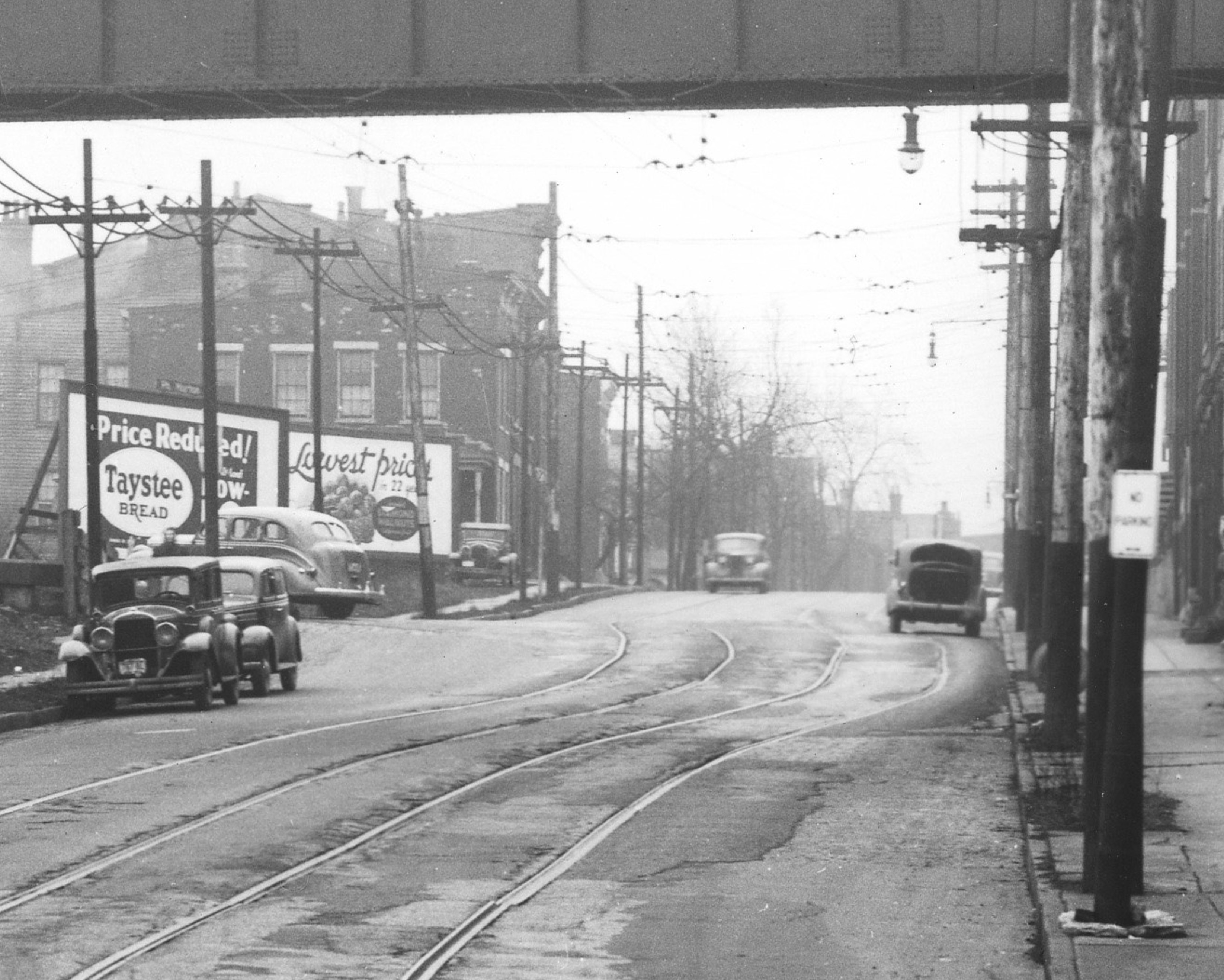 Close-up view of the previous historic photo of State Avenue at Harrison Avenue in South Fairmount. The car parked in front of the Taystee Bread billboard is on what's left of the approach to the Harrison Avenue Viaduct. Note how the streetcar tracks still bend to the right for the junction tracks that are now gone. From the University of Cincinnati Library Digital Resource Commons, Street Construction and Improvements collection.