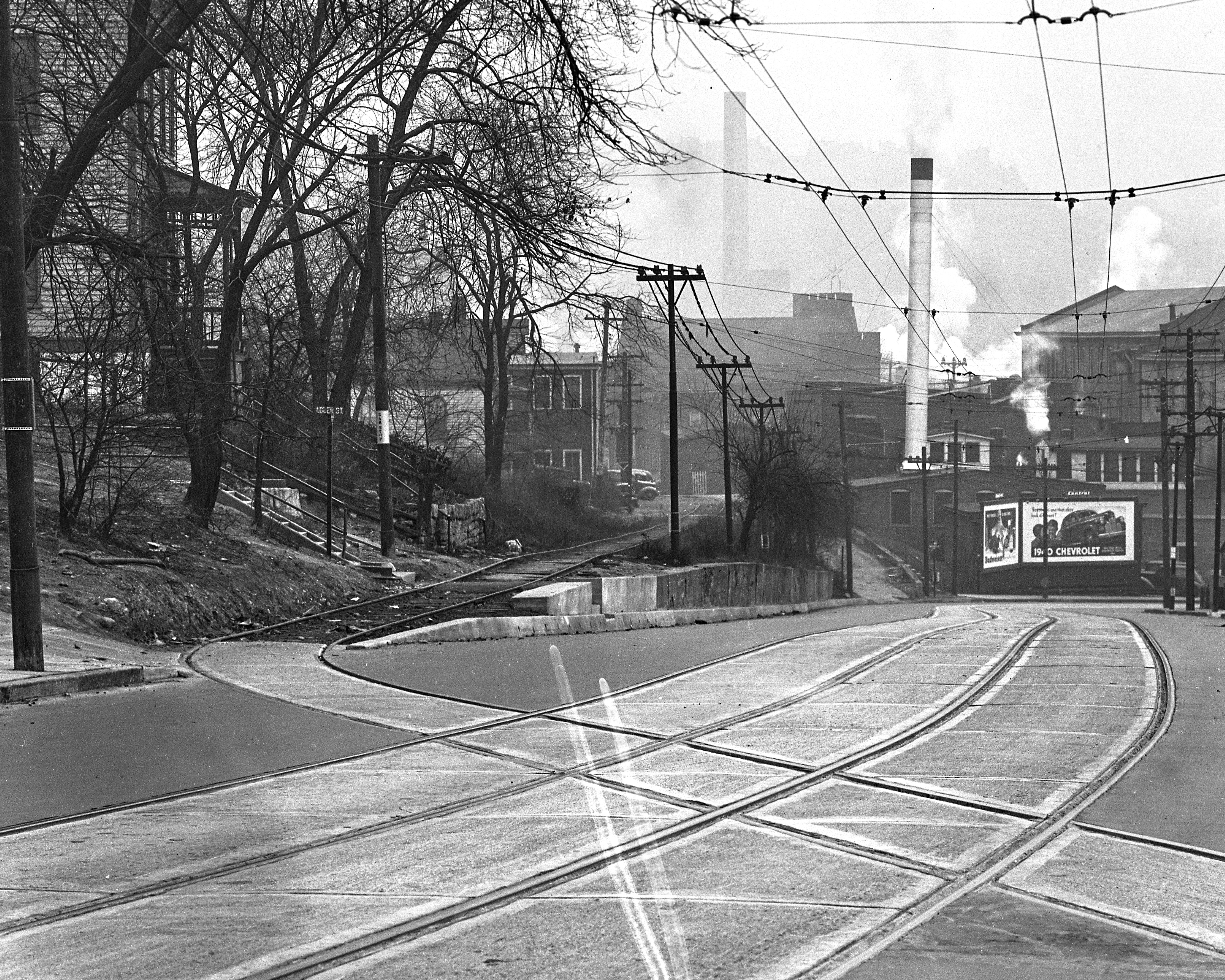 Close-up of the previous photo of the Cincinnati & Westwood tracks crossing Harrison Avenue in South Fairmount after repaving, looking east. The concrete retaining wall and high curb with weep holes going down Harrison are still there as of November 2013. Note that when the street and tracks were rebuilt the street railway company did not build a proper diamond for the Cincinnati & Westwood, so their one-man gasoline powered car would have to bounce across the streetcar tracks as there was no accommodation for the wheel flanges. From the University of Cincinnati Library Digital Resource Commons, Street Construction and Improvements collection.