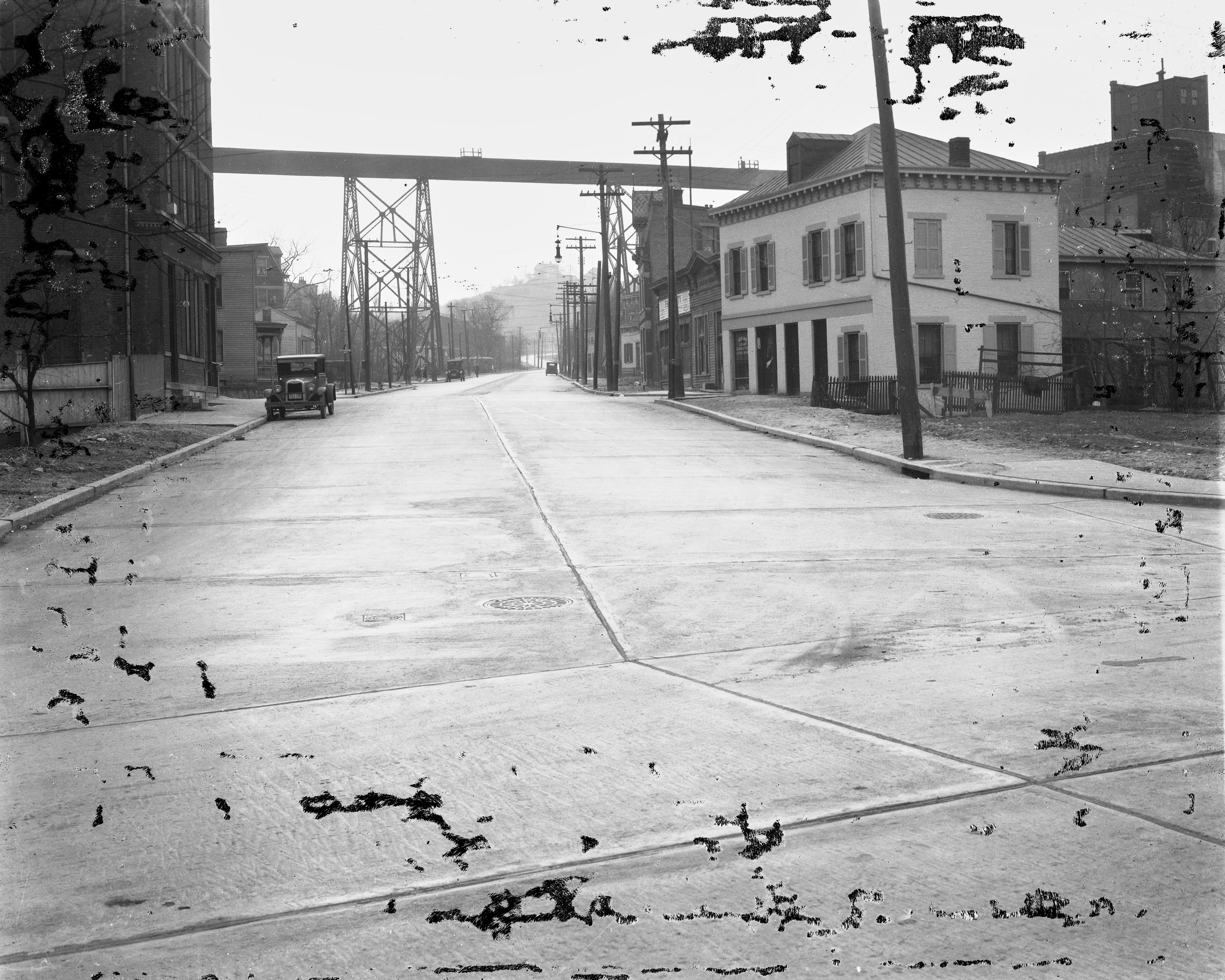 Historic photo of the C&O of Indiana trestle above Quebec Avenue in South Fairmount, looking southwest along Quebec Road from Queen City Avenue. The single-track streetcar line on Quebec can be seen going under the trestle. From the University of Cincinnati Library Digital Resource Commons, Street Construction and Improvements collection.