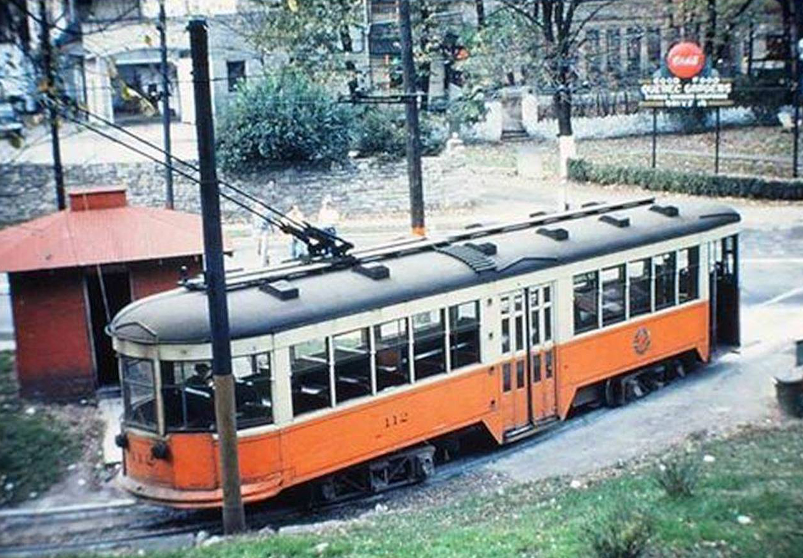 Historic photo of a streetcar on the Quebec loop across from Quebec Gardens, looking west across the street. Photo by Dave McNeil.