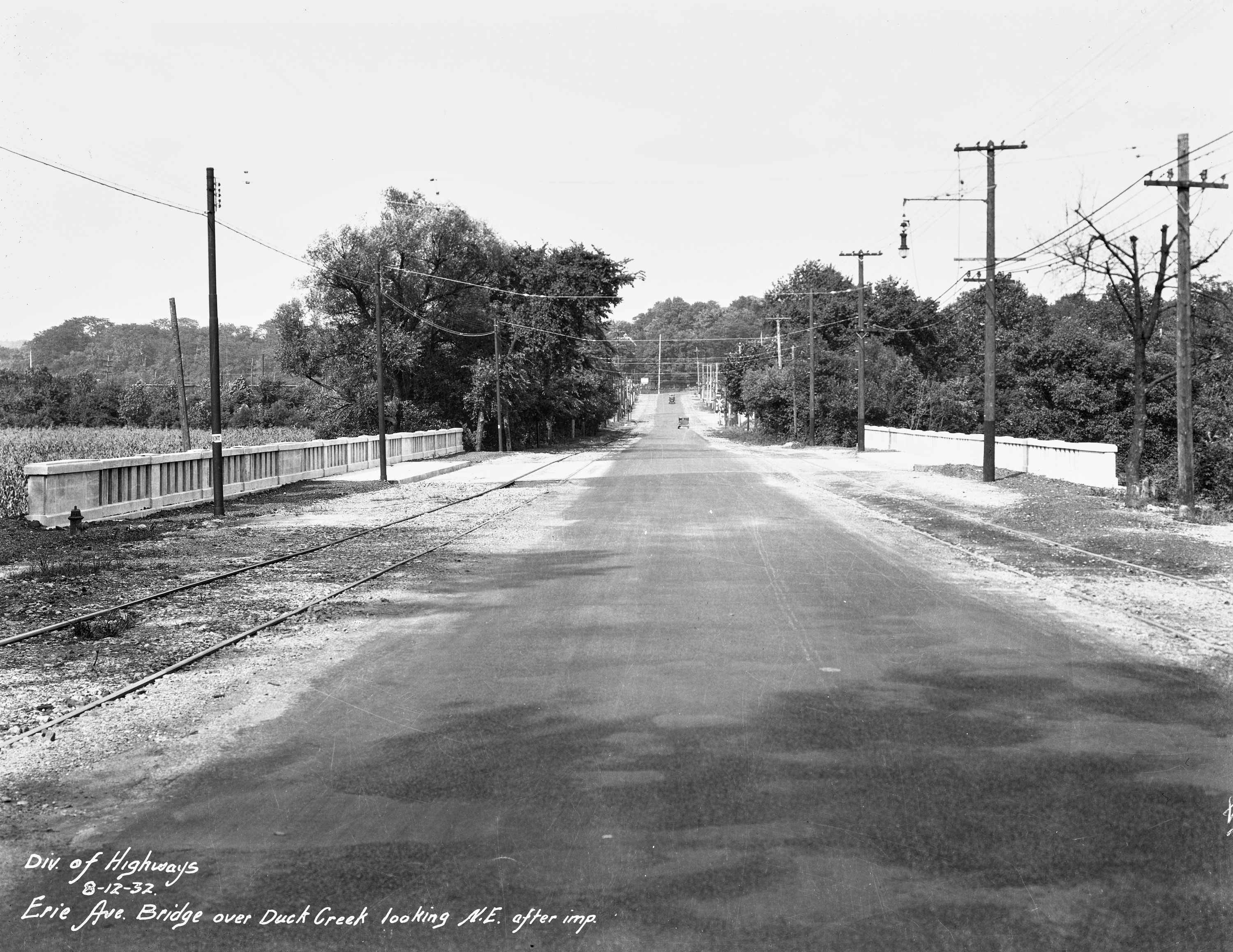 Historic photo of Erie Avenue at the Duck Creek Bridge near today's Deupree House in East Hyde Park, looking northeast towards Madisonville and the PRR Richmond Division railroad tracks. From the University of Cincinnati Library Digital Resource Commons, Street Construction and Improvements collection.