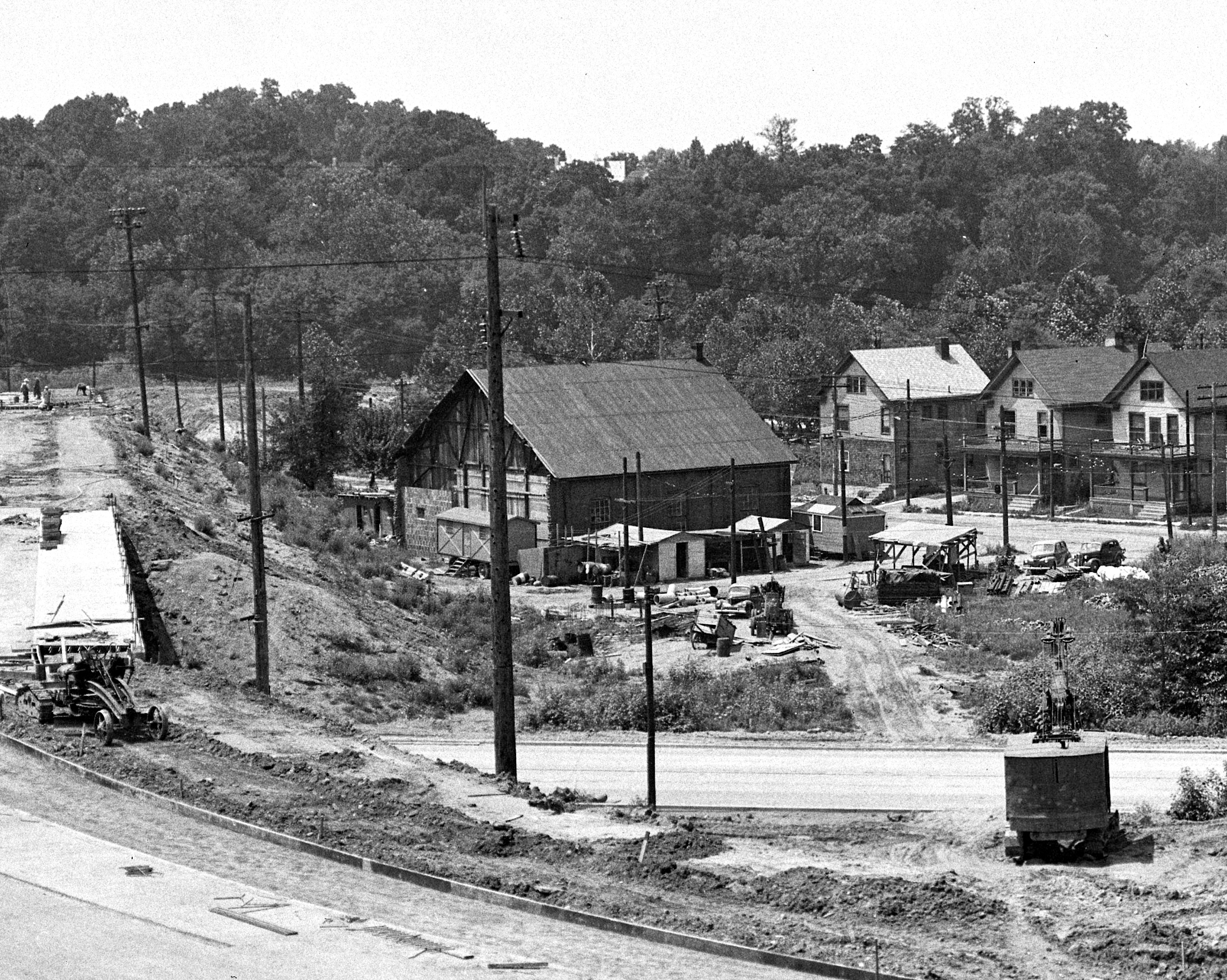 Close up view of the previous historic photo showing the partially demolished CM&B car barn, looking west across the realigned Erie Avenue and Red Bank Road. From the University of Cincinnati Library Digital Resource Commons, Street Construction and Improvements collection.