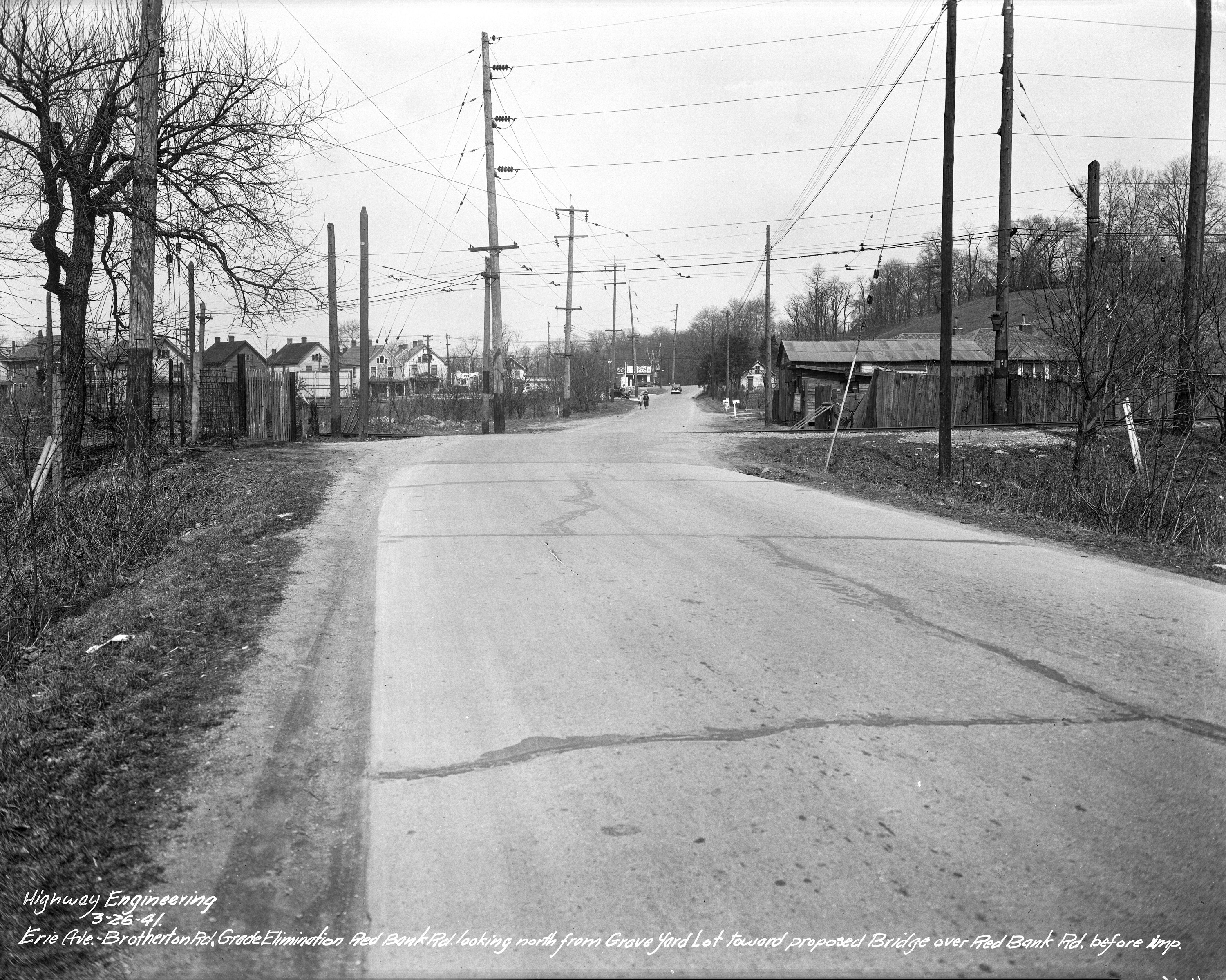 Historic photo of former CM&B tracks crossing Red Bank Road, looking north. The houses in the distance on the left are on the old Erie Avenue. The current Erie Avenue overpass is at this location today. At this time the CM&B was operated by the street railway to Mariemont. From the University of Cincinnati Library Digital Resource Commons, Street Construction and Improvements collection.