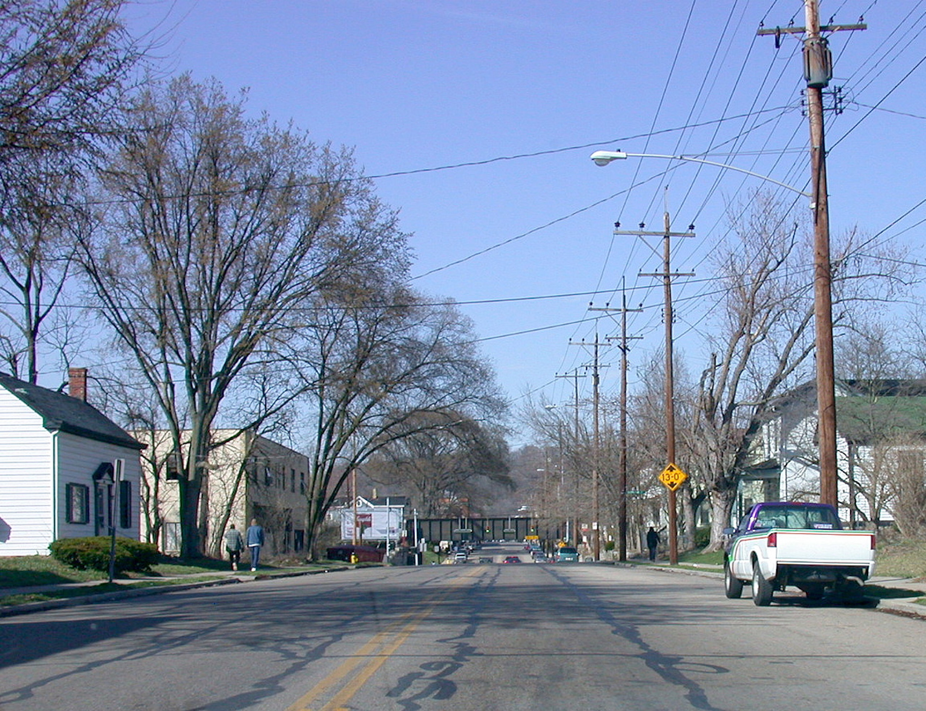 Buried tracks revealed by cracked and repaired pavement on Whetsel Street in Madisonville, looking north from Roe.