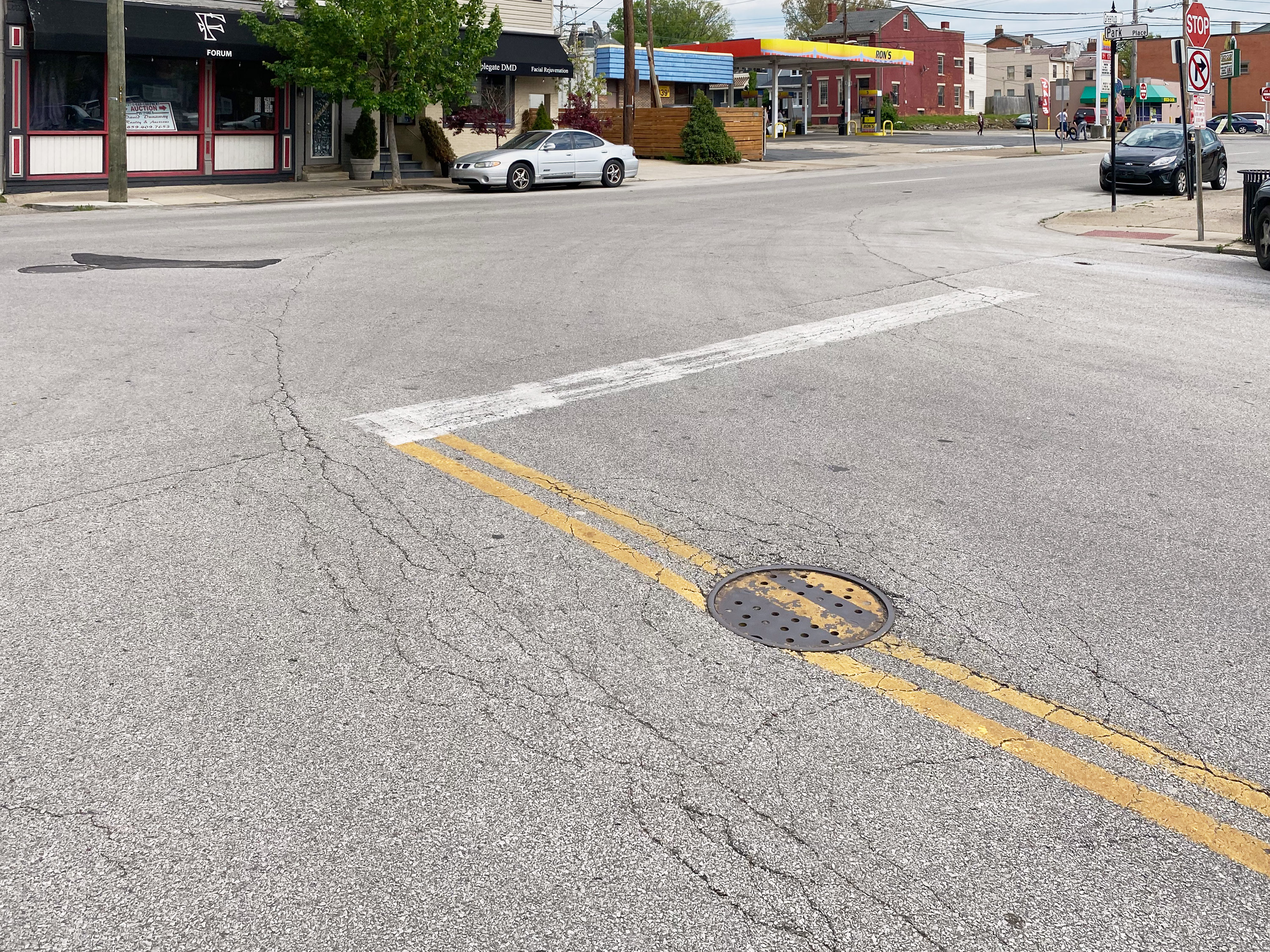 Cracks in the street reveal buried tracks at Greenup Street and Park Place in downtown Covington, looking southeast.