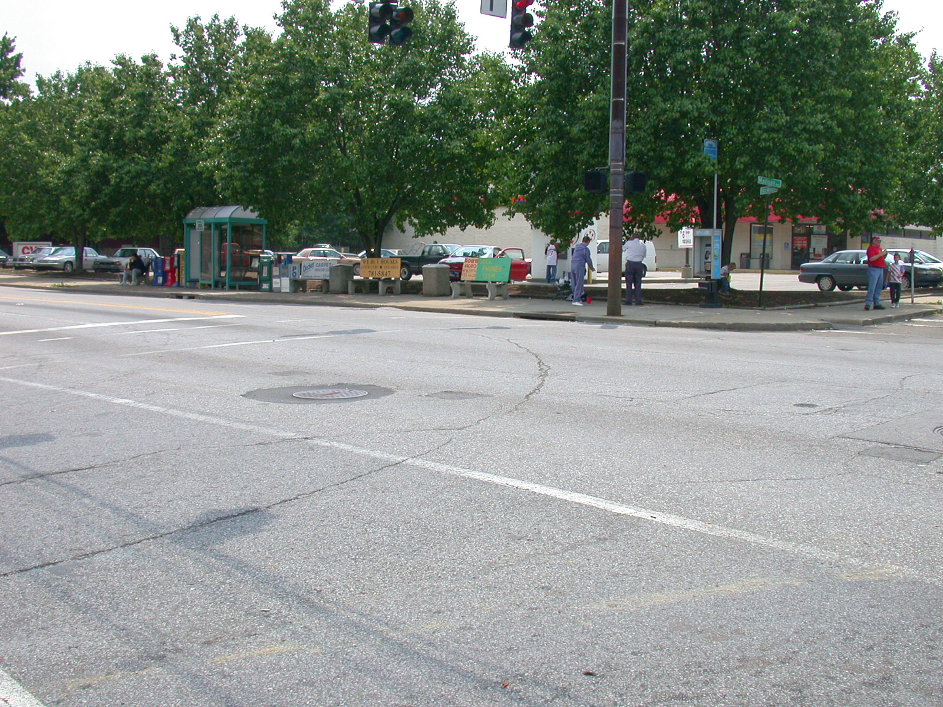 Cracks in the street reveal buried tracks at the corner of 20th and Madison in Covington, looking southwest. Carbarns were once located beyond the trees where a CVS now sits..