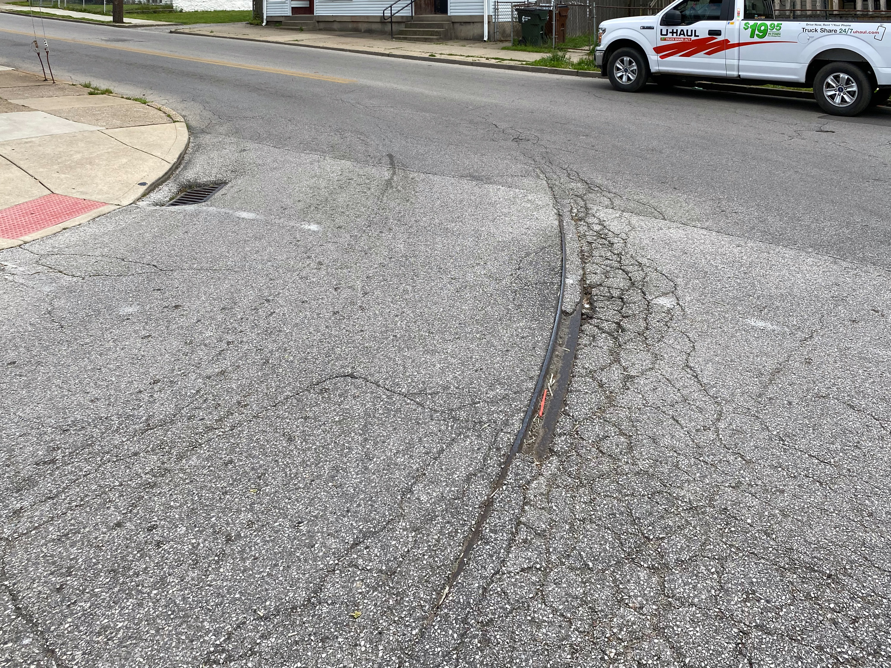Cracks in the street reveal buried tracks for the start of the Route 5 Holman loop at Holman and 19th Streets in Covington, looking southeast.