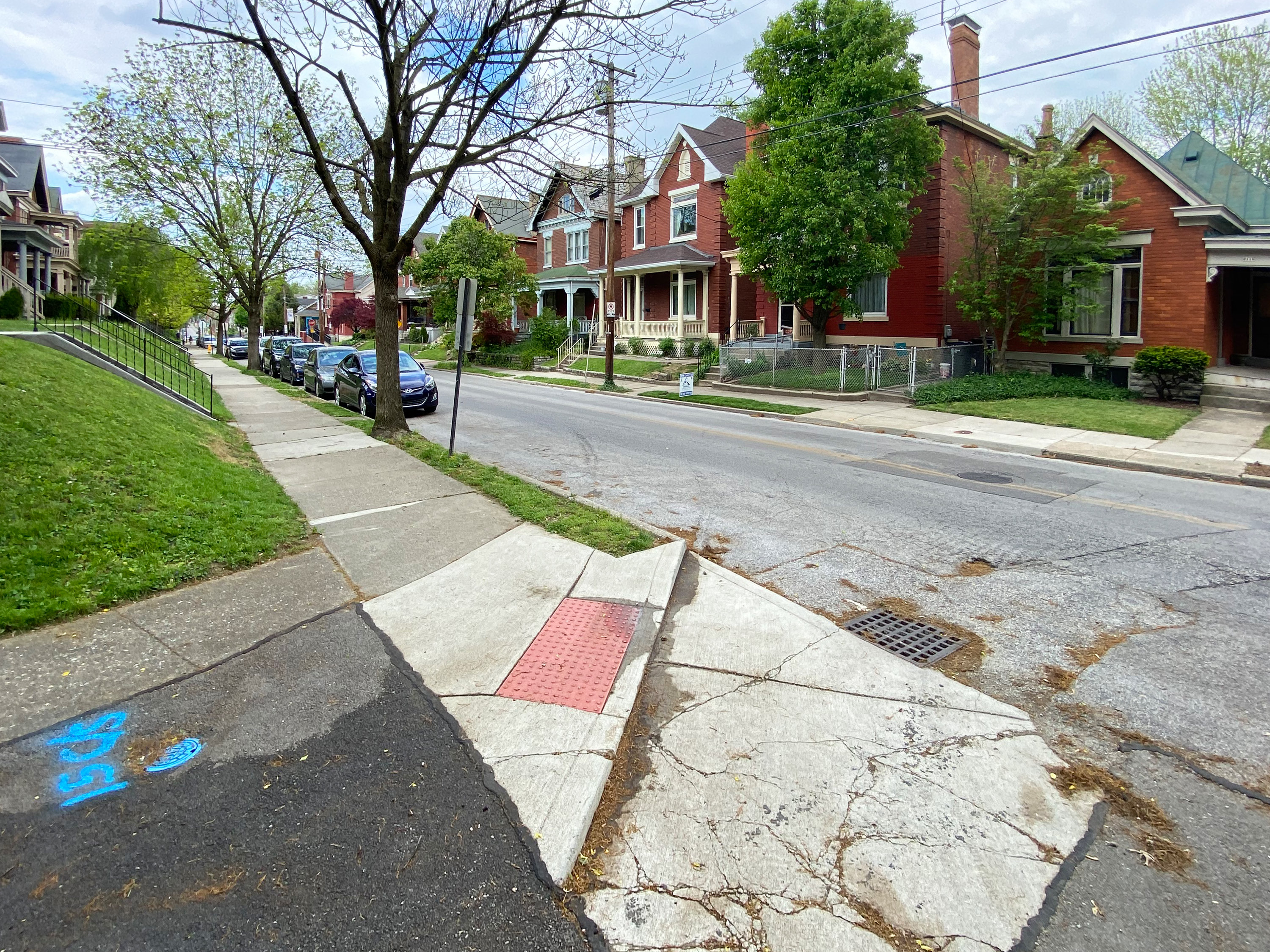 Close-up view of the buried tracks for the end of Route 8 Eastern Avenue at Durrett Street in Covington near the edge of Wallace Woods, looking northeast.