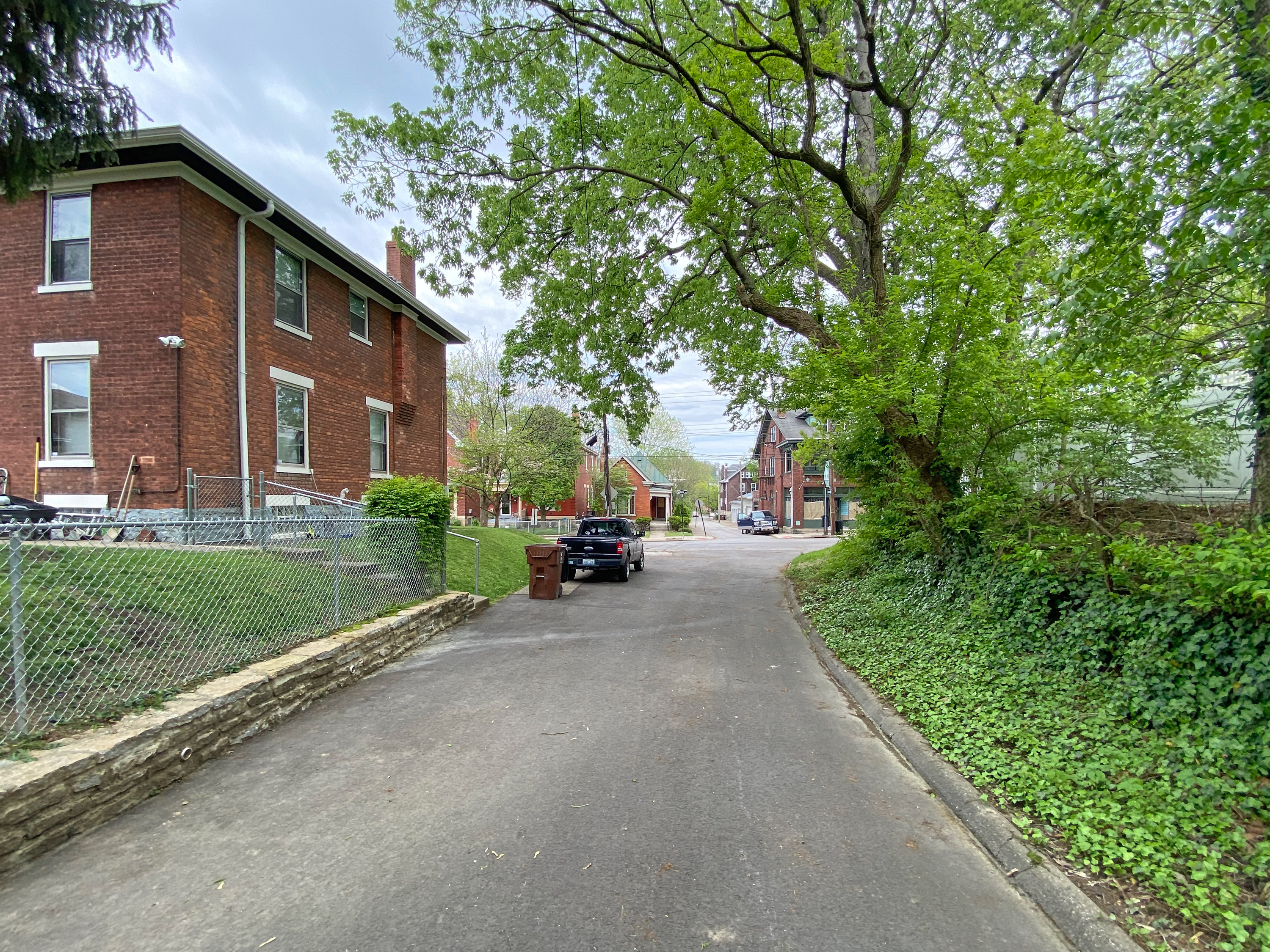 Route 8 Eastern Avenue right-of-way at Durrett Street in Covington near the edge of Wallace Woods, looking east.