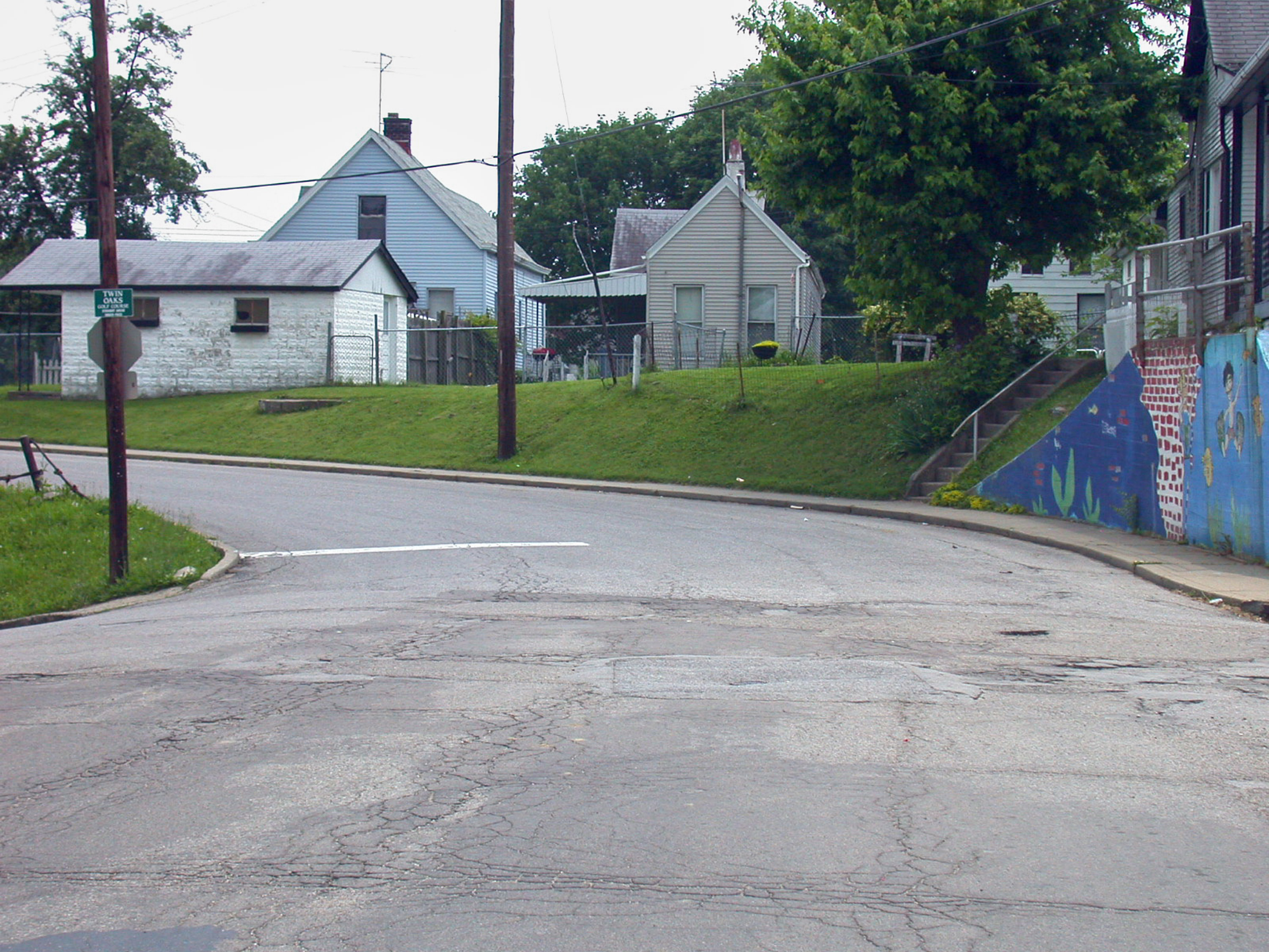 Cracks in the street reveal buried tracks at the intersection of Huntington Avenue and 40th Street in Covington, looking south.