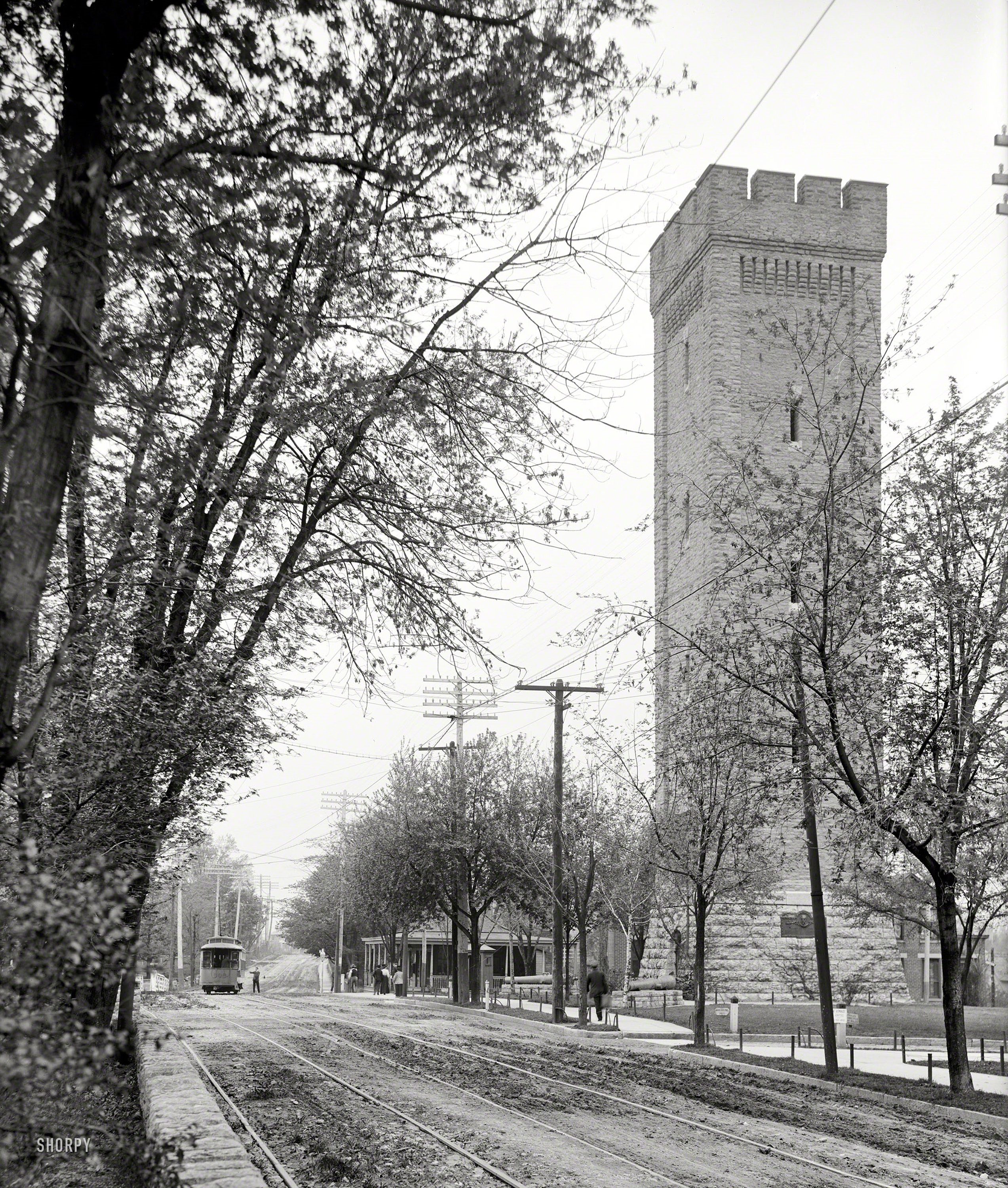 Historic photo of Ft. Thomas Avenue at the entrance to the original fort, today's Tower Park, looking north. The street has since been widened to the left, removing the wall at the bottom left of the photo. Original image from the Library of Congress, restored by Shorpy.