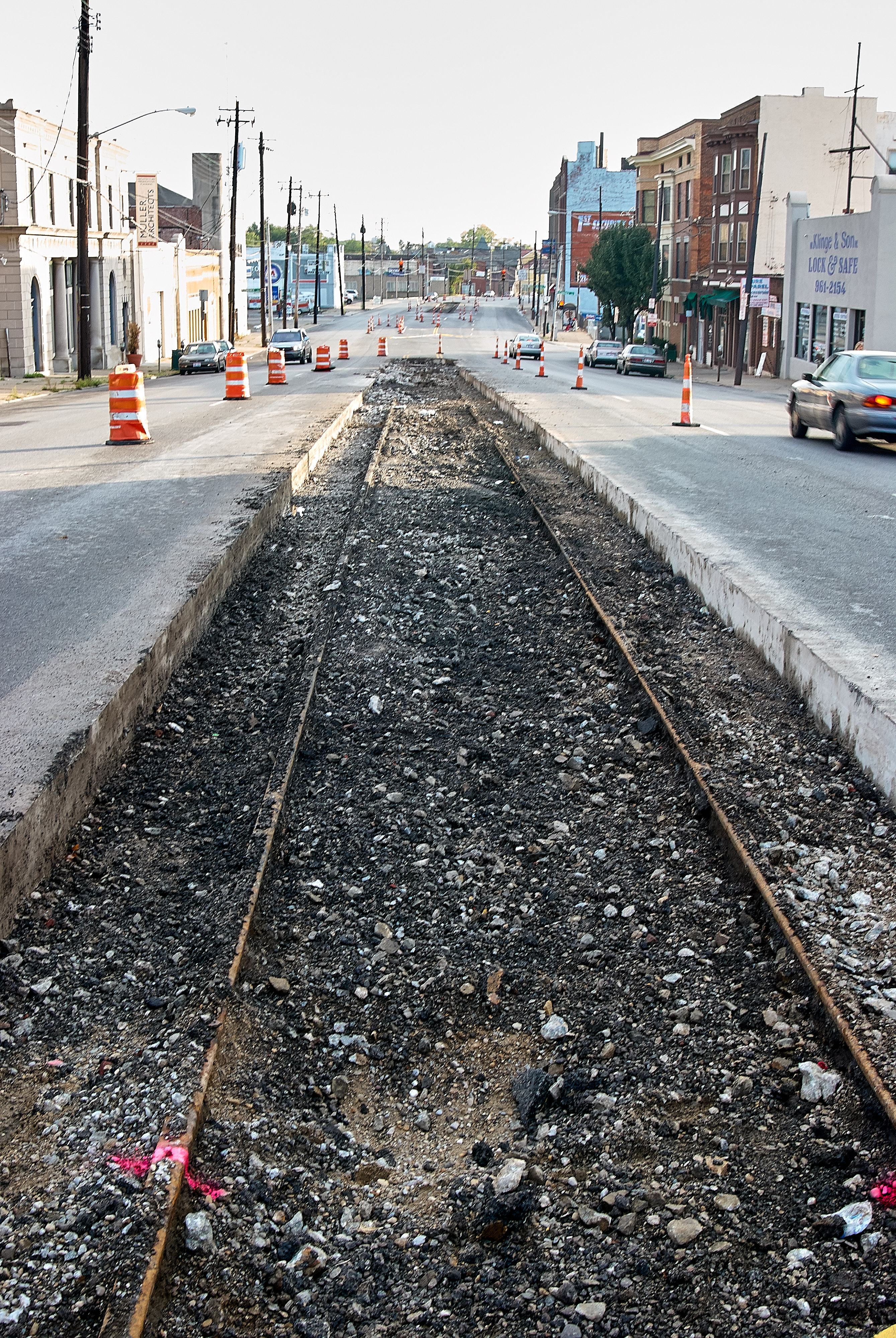 Exposed track work on Gilbert Avenue in Walnut Hills/Peeble's Corner, looking south. While it looks like a single track running down the middle of the road, what is actually shown here is half of the northbound and half of the southbound track.