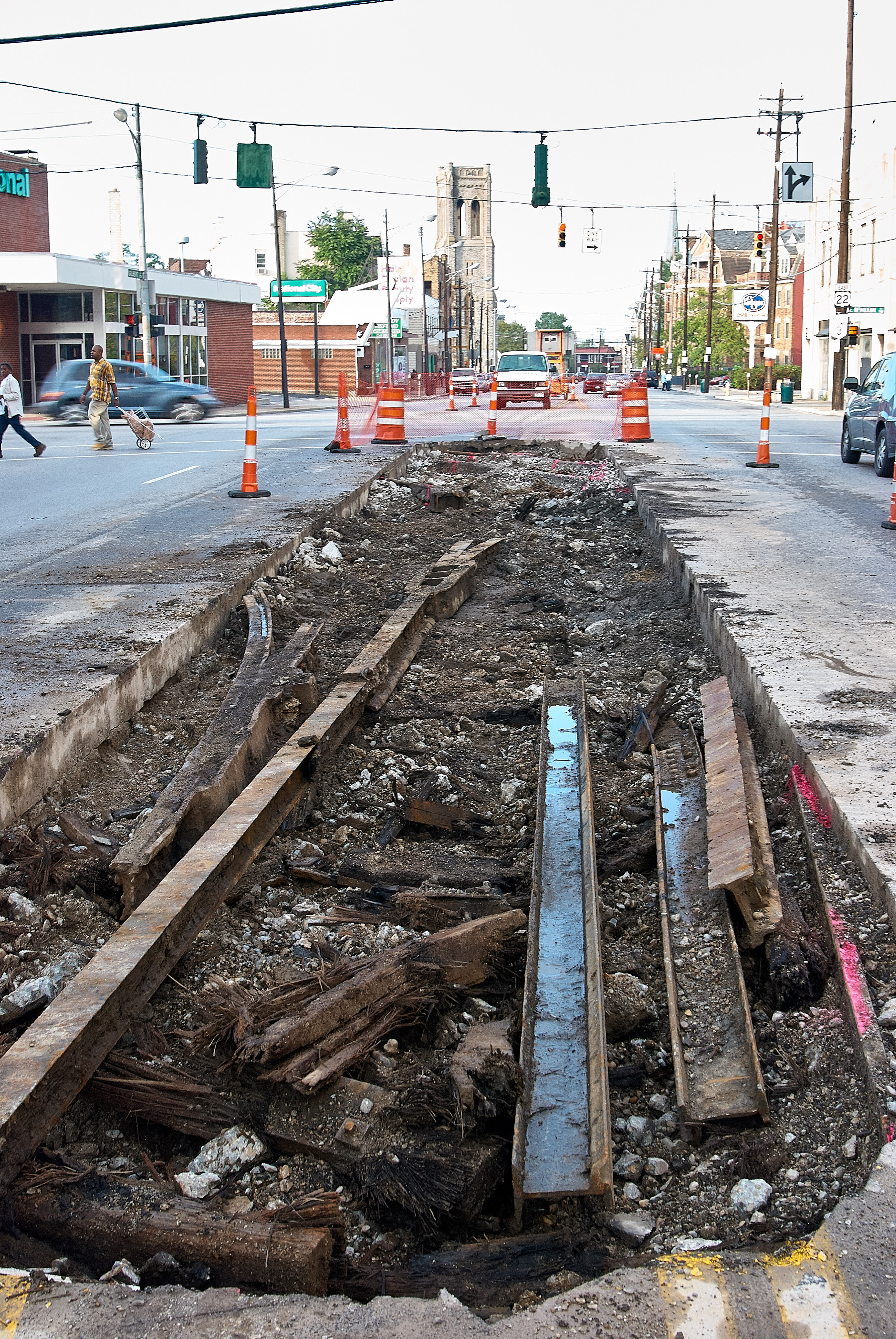 Exposed track work on Gilbert Avenue in Walnut Hills/Peeble's Corner, looking north towards the intersection of Gilbert and McMillan. The tower for Walnut Hills Presbyterian Church is in the distance.