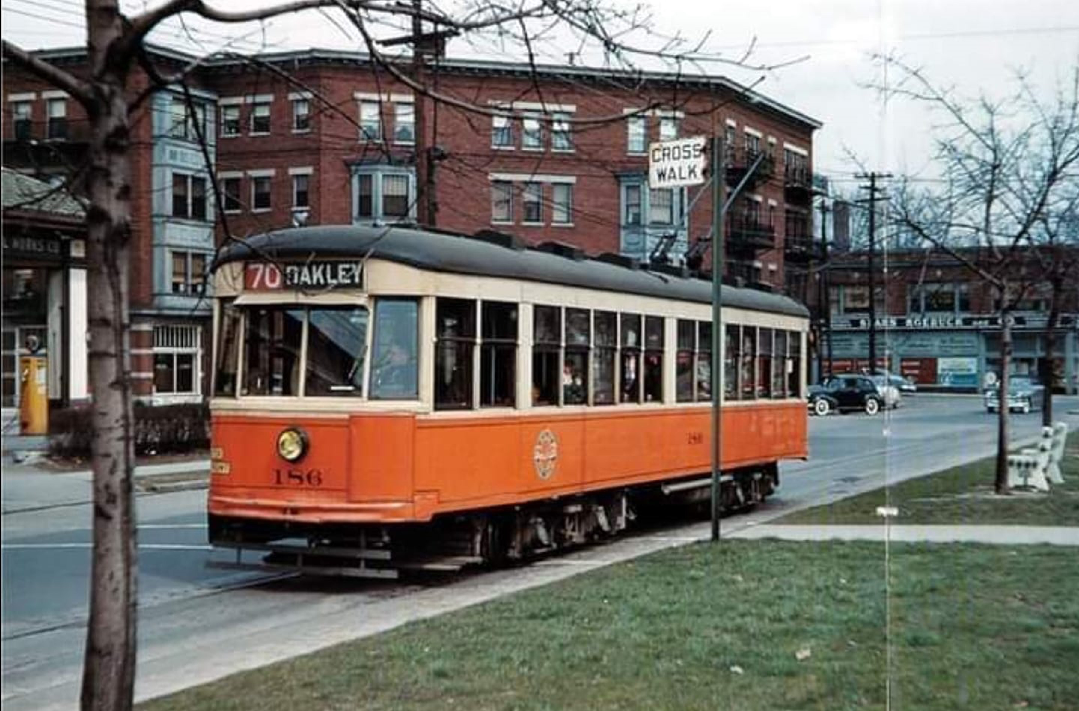 Historic photo of a streetcar at Oakley Square, looking north towards Markbriet Avenue. Note the old Sears store on the right, which is now the King Arthur's Court toy store.
