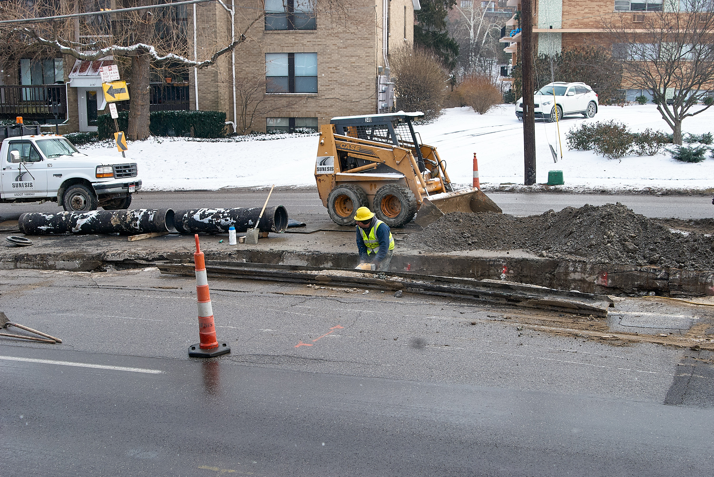 Water main replacement reveals buried streetcar tracks on Madison Road in O'Bryonville, looking south across Madison near Paul Street.