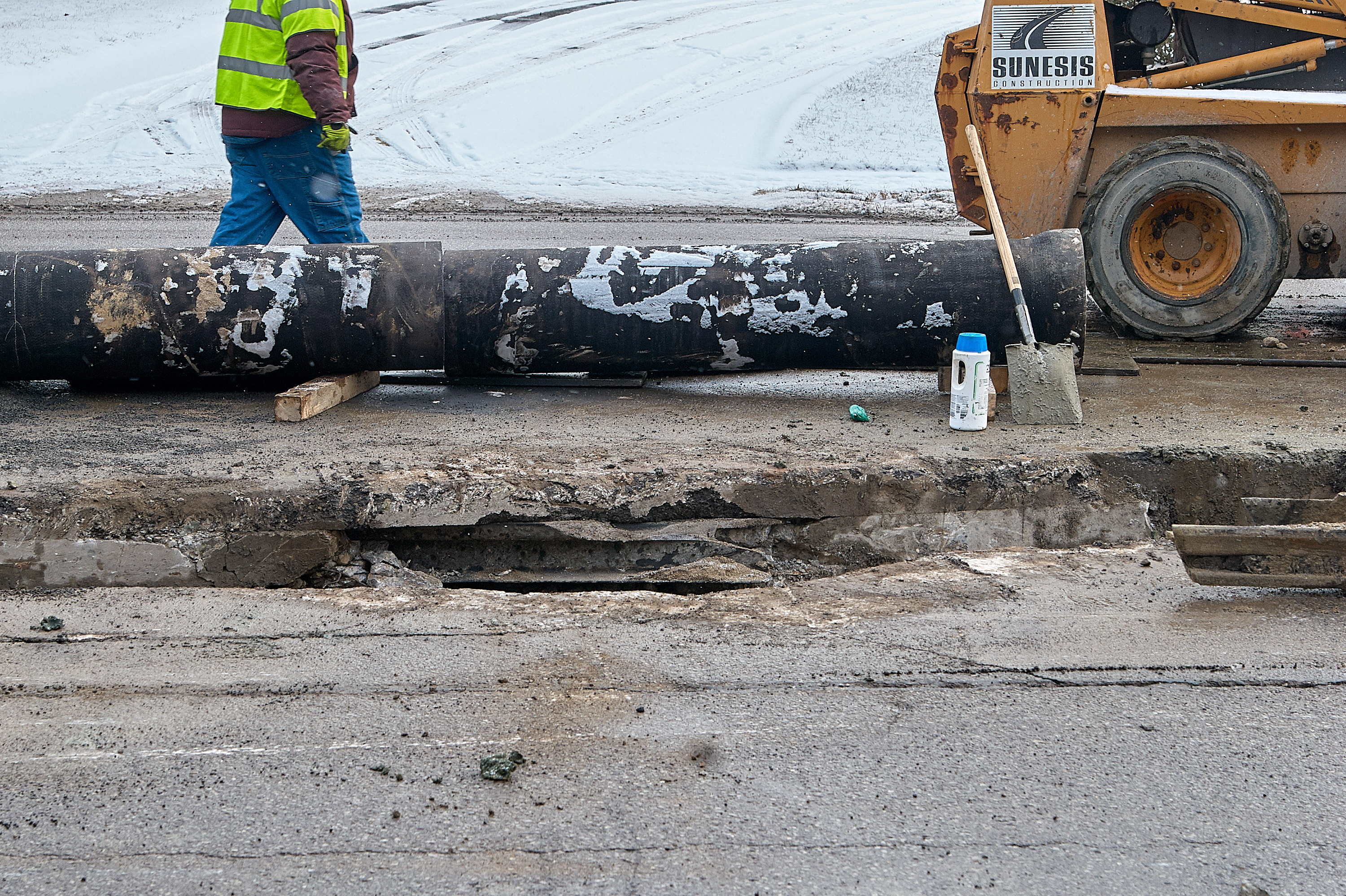 Water main replacement reveals buried streetcar tracks on Madison Road in O'Bryonville, looking south across Madison near Paul Street.